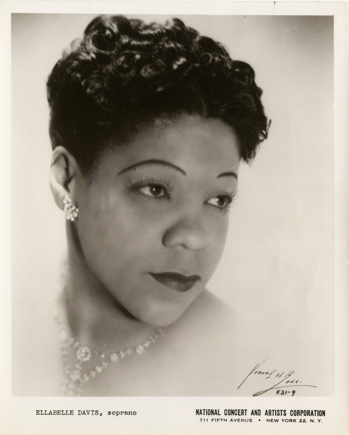 Favorite this☆ Ellabelle Davis Description: Portrait of soprano Ellabelle Davis. Printed on front: "Ellabelle Davis, soprano. National Concert and Artists Corporation, 711 Fifth Avenue, New York 22, N.Y. Yvonne LeRoux." Details Resource ID: hk000600 Creator: LeRoux, Yvonne Subject: Davis, Ellabelle, 1907-1960 African American women singers Photographic prints Date Issued: Unknown year Format: 1 photographic print ; 10 x 8 in. Member of: E. Azalia Hackley Collection Filing Location: Biography--Davis, Ellabelle Rights: Physical rights are retained by DPL. Copyright is retained in accordance with U.S. copyright laws.