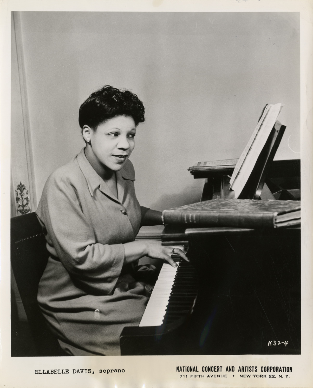 Portrait of soprano Ellabelle Davis rehearsing at the piano. Printed on front: "Ellabelle Davis, soprano. National Concert and Artists Corporation, 711 Fifth Avenue, New York 22, N.Y." Label on back: "Practice makes perfect. En route to [blank] for an appearance at the [blank] on [blank], Ellabelle Davis, sensational American Negro soprano, is her own accompanist for a rehearsal session in which she goes over some of the arias and art songs which have won her acclaim from press and public of two continents. Photo: Robert M. Lewis."