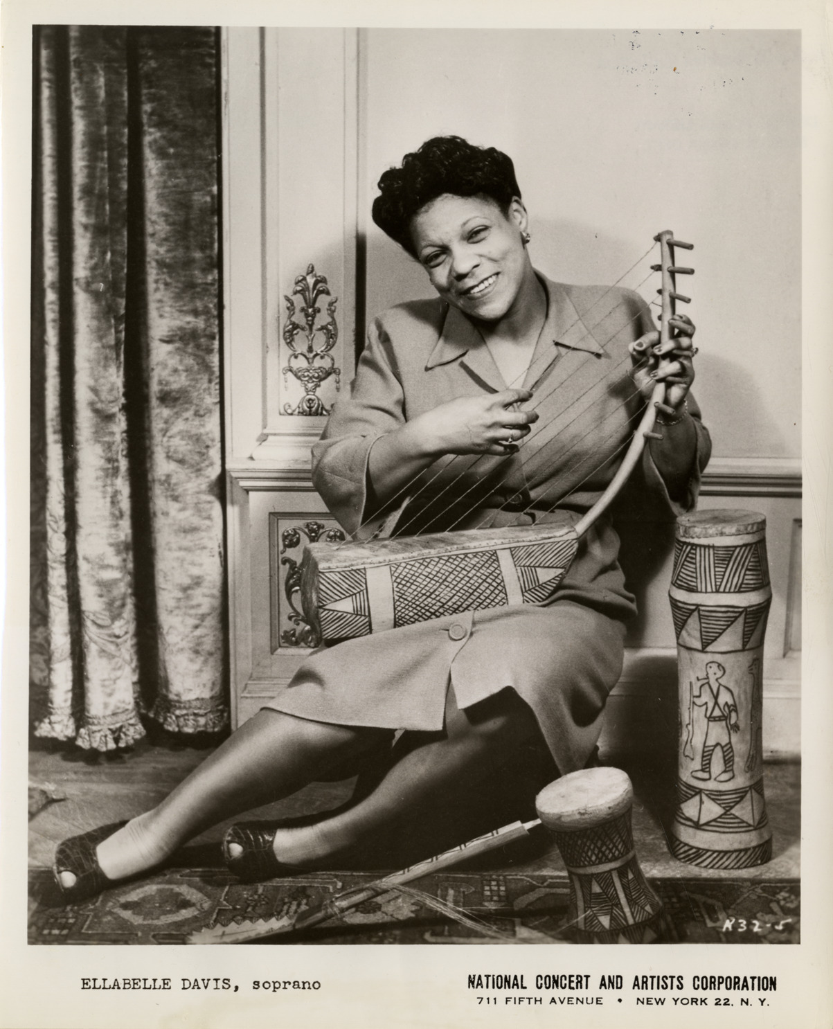 View of soprano Ellabelle Davis posing with harp bow and drum. Printed on front: "Ellabelle Davis, soprano. National Concert and Artists Corporation, 711 Fifth Avenue, New York 22, N.Y." Label on back: "Musical hobbyist. A doubly appropriate hobby is that of Ellabelle Davis, the celebrated American Negro soprano, who will be heard in concert at the [blank] in [blank] on [blank]. Proud of her race's long musical tradition, Miss Davis has spent many years assembling a collection of African instruments, ranging from crude bone flutes to beautifully shaped drums and exotic stringed instruments. Photo: Robert M. Lewis."