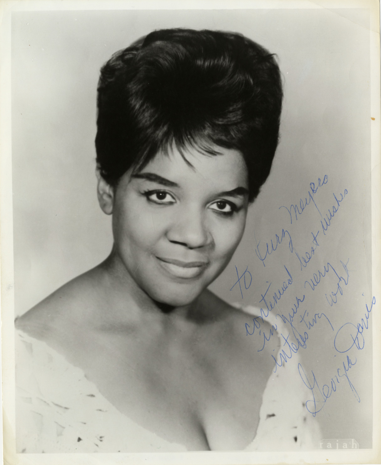 Favorite this☆ Georgia Davis Description: Portrait of mezzo-soprano Georgia Davis. Autographed on front: "To Kurz Meyers, continued best wishes in your very interesting work, Georgia Davis." Details Resource ID: hk000612 Subject: Davis, Georgia (Singer) Davis, Georgia (Singer)--Autographs African American women singers Photographic prints Date Issued: Unknown year Format: 1 photographic print ; 10 x 8 in. Member of: E. Azalia Hackley Collection Filing Location: Biography--Davis, Georgia Rights: Physical rights are retained by DPL. Copyright is retained in accordance with U.S. copyright laws.