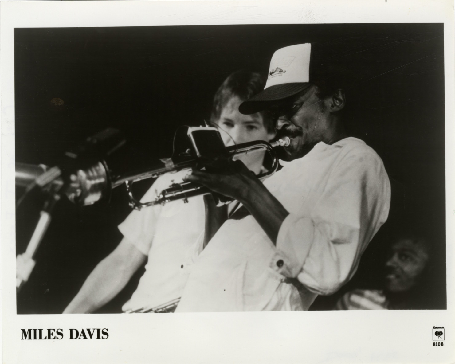View of jazz musician Miles Davis playing trumpet. Another man stands in background. Printed on front: "Miles Davis." Handwritten on back: "At Pine Knob Music Theatre, August 20."