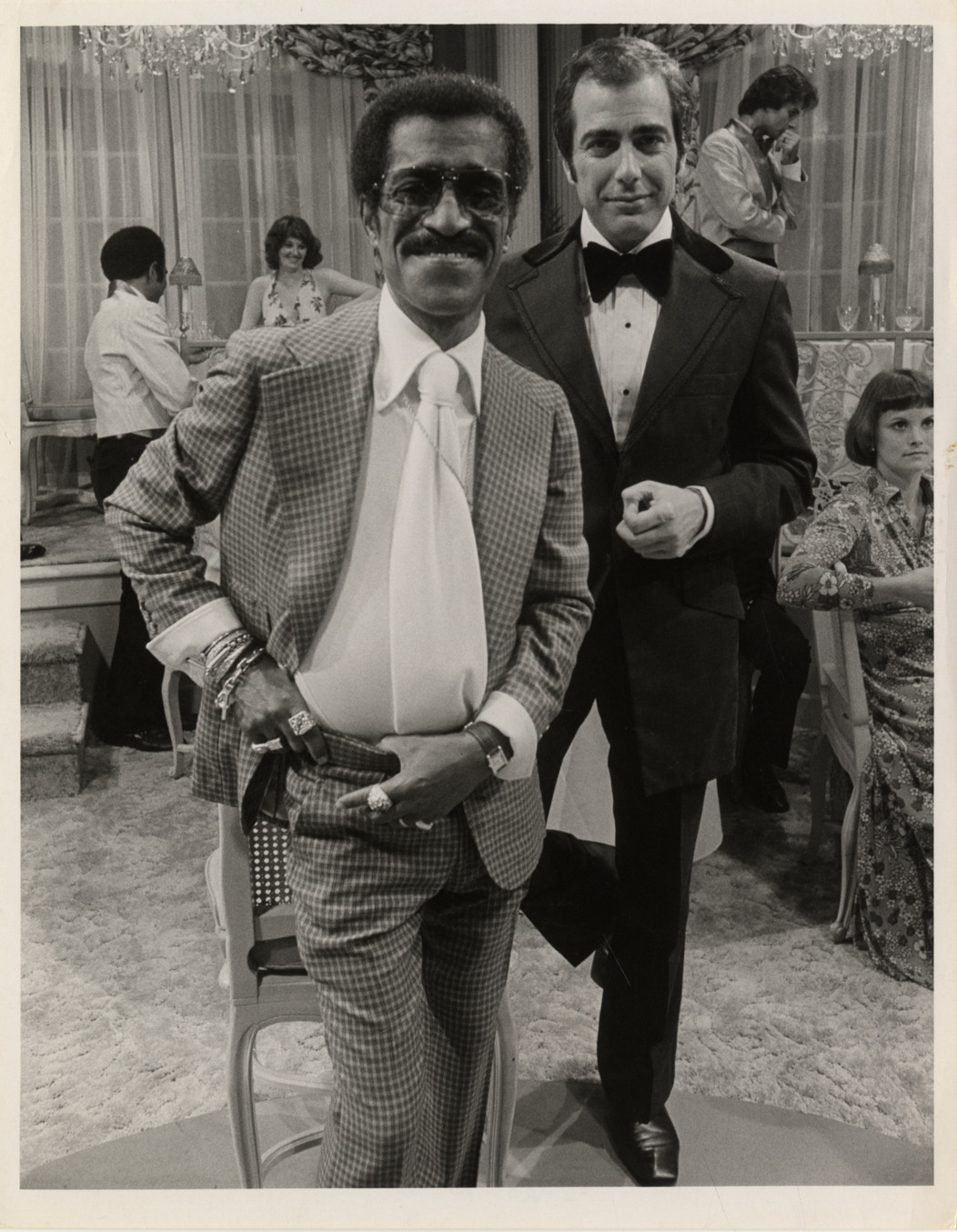 View of actors Sammy Davis, Jr. and Jerry Lacy in a scene from the television soap opera, "Love of life." Label on back: "Sammy Davis Jr., who actually is a great fan of the "Love of life" series, drops in at the new Beaver Ridge complex, run by a longtime friend, Rick, played by series regular Jerry Lacy, when Davis is a special guest on the popular daytime drama, Friday, Oct. 10 (11:30-11:55 AM, ET) on the CBS Television Network. Within the story on the serial, which celebrates its 24th anniversary on September 24, Davis stops by at the complex's Terrace Room and is coaxed into singing a couple of tunes." Handwritten on back: "Davis, Sammy, Jr."