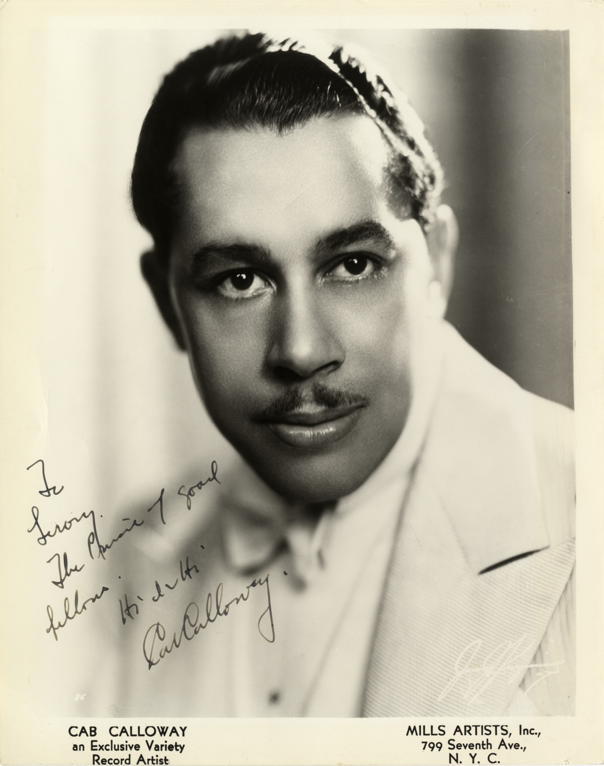 Portrait of jazz musician and bandleader Cab Calloway. Autographed on front: "To Leroy, the prince of good fellows. Hi de hi, Cab Calloway." Printed on front: "Cab Calloway, an exclusive Variety recording artist. Mills Artists, Inc., 799 Seventh Ave., N.Y.C. James J. Kriegsmann."