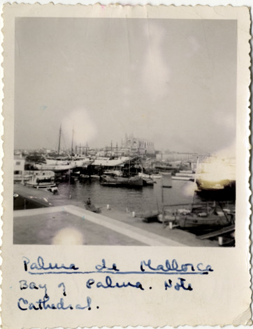 View of Bay of Palma at Palma de Mallorca, Spain. Handwritten on front: "Palma de Mallorca. Bay of Palma. Note cathedral." Handwritten on back: "Mattiwilda Dobbs."