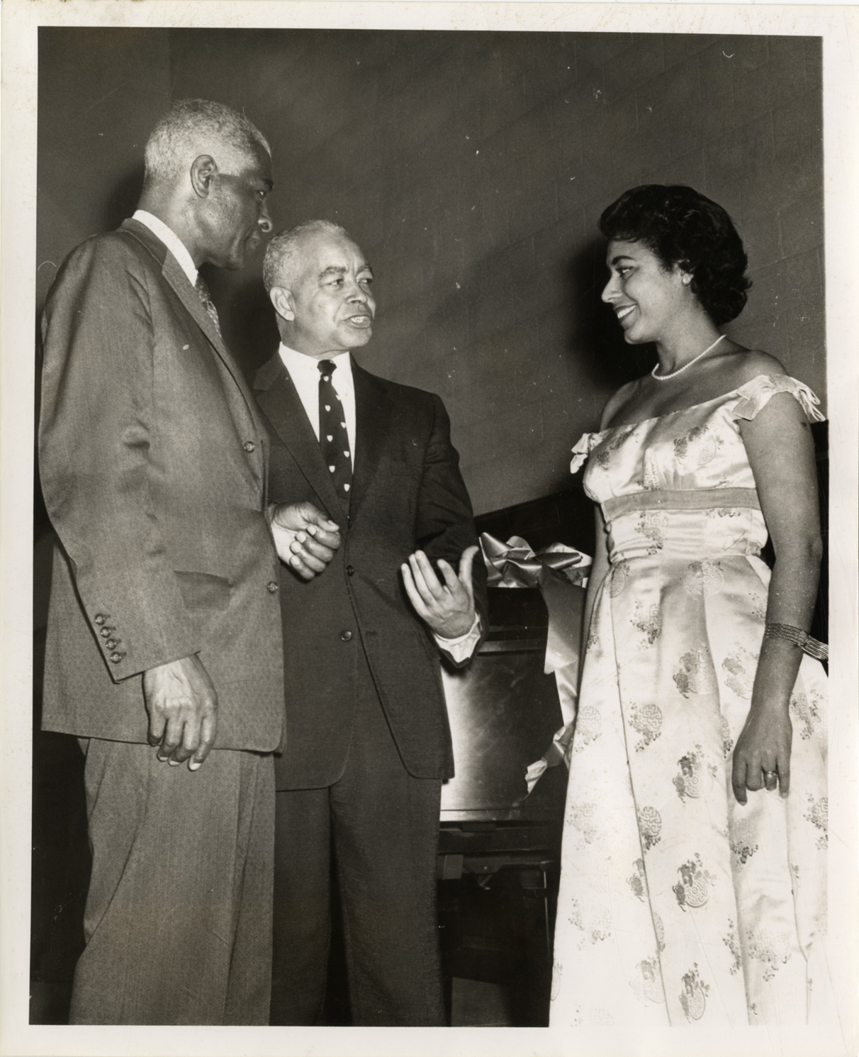 Favorite this☆ Mattiwilda Dobbs speaking with two unidentified men Description: Portrait of soprano Mattiwilda Dobbs speaking with two unidentified men. Handwritten on back: "Mattiwilda Dobbs." Details Resource ID: hk000726 Subject: Dobbs, Mattiwilda African American women singers Photographic prints Date Issued: Unknown year Format: 1 photographic print ; 10 x 8 in. Member of: E. Azalia Hackley Collection Filing Location: Biography--Dobbs, Mattiwilda (Europe) Rights: Physical rights are retained by DPL. Copyright is retained in accordance with U.S. copyright laws.
