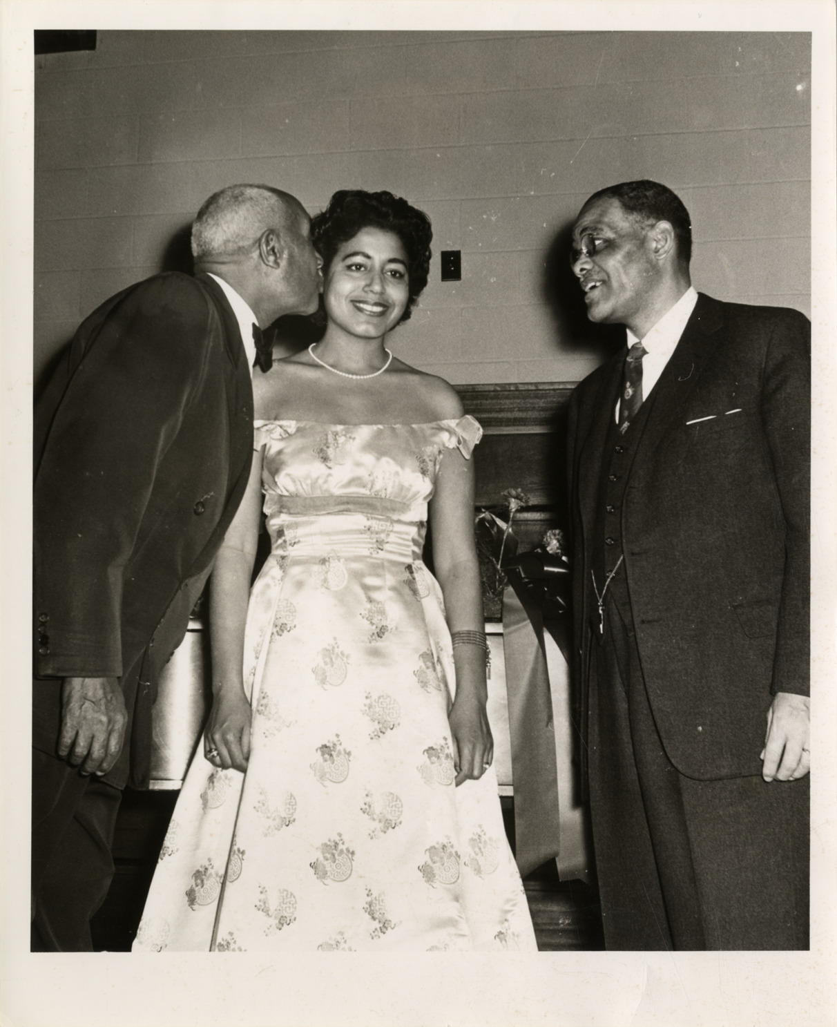 Portrait of soprano Mattiwilda Dobbs posing with two unidentified men. One man kisses her on cheek. Handwritten on back: "Mattiwilda Dobbs."