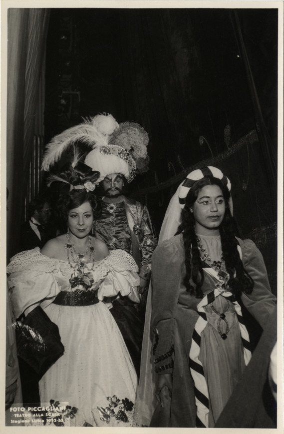 View of soprano Mattiwilda Dobbs and cast members in a scene from unidentified opera. Printed on front: "Foto Piccagliani, Teatro alla Scala, Stagione Lirica 1952-53." Handwritten on back: "M. Dobbs."