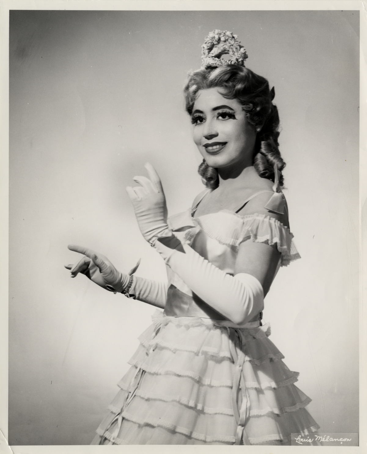 Portrait of soprano Mattiwilda Dobbs as Olympia in Offenbach's opera, "Contes d'Hoffmann." Printed on front: "Louis Melancon." Stamped on back: "The use of this photograph is granted with the understanding that it is for your publication only, and will not be syndicated, rented, loaned, or used for advertising purposes without written permission. When published, the customary credit line will be appreciated with the name in full: Louis Melancon. Louis Melancon, New York, N.Y." Handwritten on back: "Mattiwilda Dobbs, Olympia in 'Contes d'Hoffmann.'"