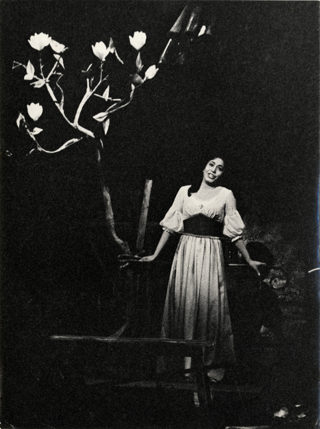 View of soprano Mattiwilda Dobbs as Gilda in Verdi's opera, "Rigoletto." Stamped on back: "Copyright by Peyer. Fritz Peyer, Hamburg-Fuhlsbuttel, Heschredder 55, tel: 59 75 90." Handwritten on back: "Giuseppe Verdi, Rigoletto, Mattiwilda Dobbs (Gilda)."