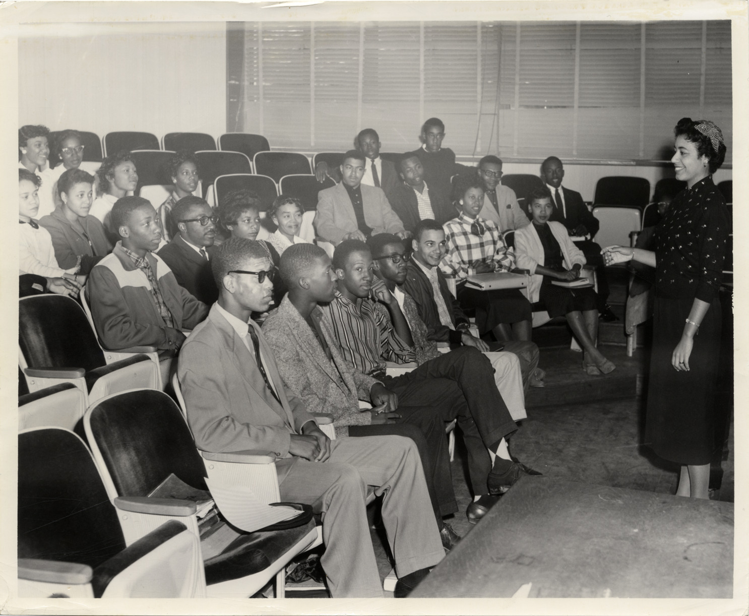 Favorite this☆ Mattiwilda Dobbs speaking to group of students Description: View of soprano Mattiwilda Dobbs speaking to a group of students in classroom. Handwritten on back: "Mattiwilda Dobbs." Details Resource ID: hk000766 Subject: Dobbs, Mattiwilda African American women singers African American students Photographic prints Date Issued: Unknown year Format: 1 photographic print ; 8 x 10 in. Member of: E. Azalia Hackley Collection Filing Location: Biography--Dobbs, Mattiwilda (Fans and family) Rights: Physical rights are retained by DPL. Copyright is retained in accordance with U.S. copyright laws.