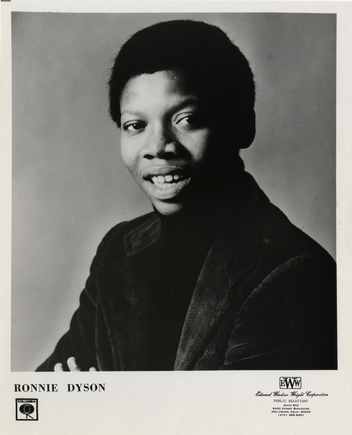 Portrait of singer Ronnie Dyson. Printed on front: "Ronnie Dyson. Columbia. Edward Windsor Wright Corporation, public relations. Suite 502, 6430 Sunset Boulevard, Hollywood, Calif. 90028 (213) 466-6421."