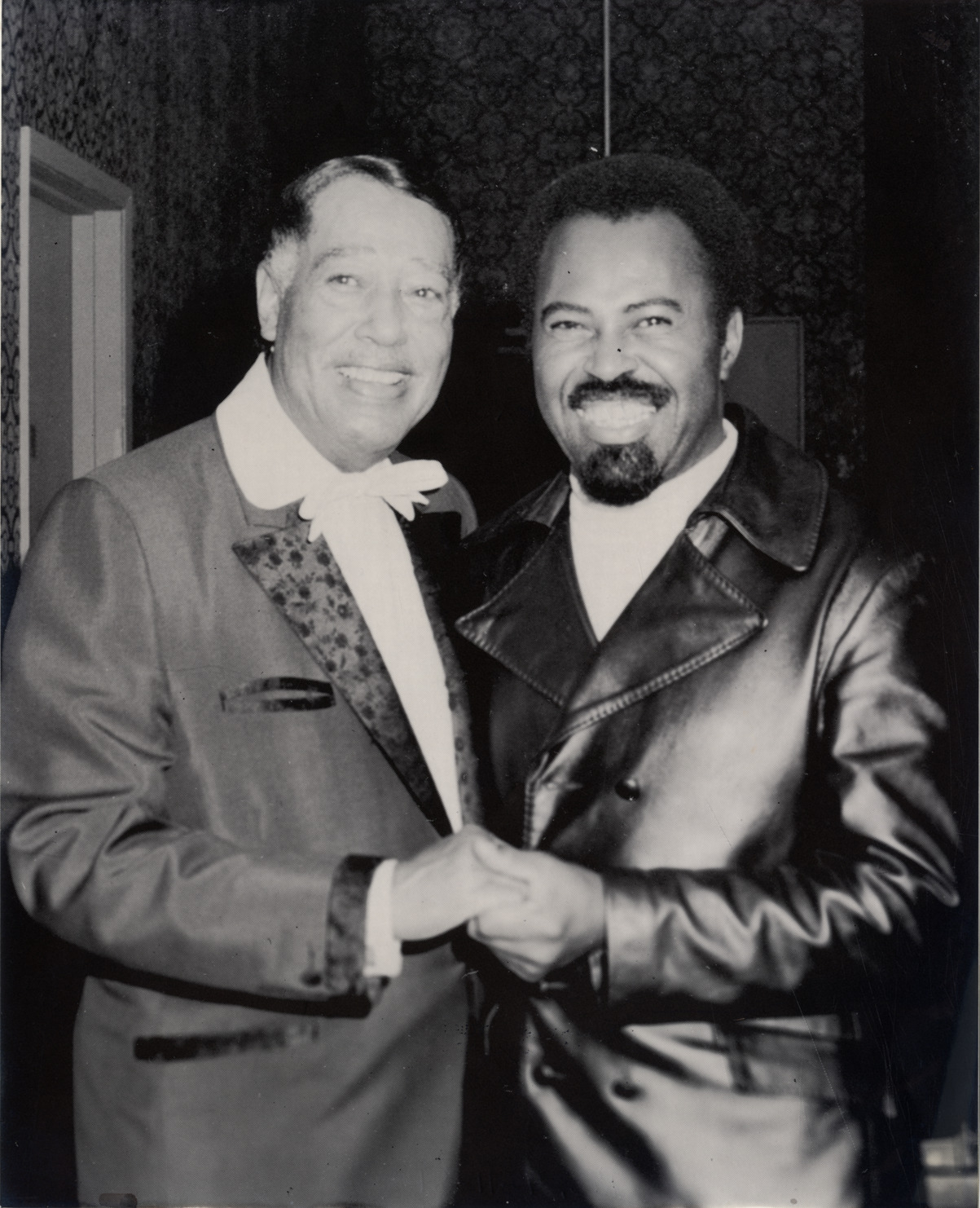 Favorite this☆ Duke Ellington posing with Walter Mason Description: Portrait of jazz musician, composer and bandleader Duke Ellington and actor Walter Mason. Handwritten on back: "Ellington, Duke. Bandleader, pianist, composter. Walter Mason." Details Resource ID: hk000809 Subject: Ellington, Duke, 1899-1974 African American jazz musicians African American pianists African American composers African American conductors (Music) Mason, Walter, 1926- Photographic prints Date Issued: Unknown year Format: 1 photographic print ; 10 x 8 in. Member of: E. Azalia Hackley Collection Filing Location: Biography--Ellington, Duke Rights: Physical rights are retained by DPL. Copyright is retained in accordance with U.S. copyright laws.