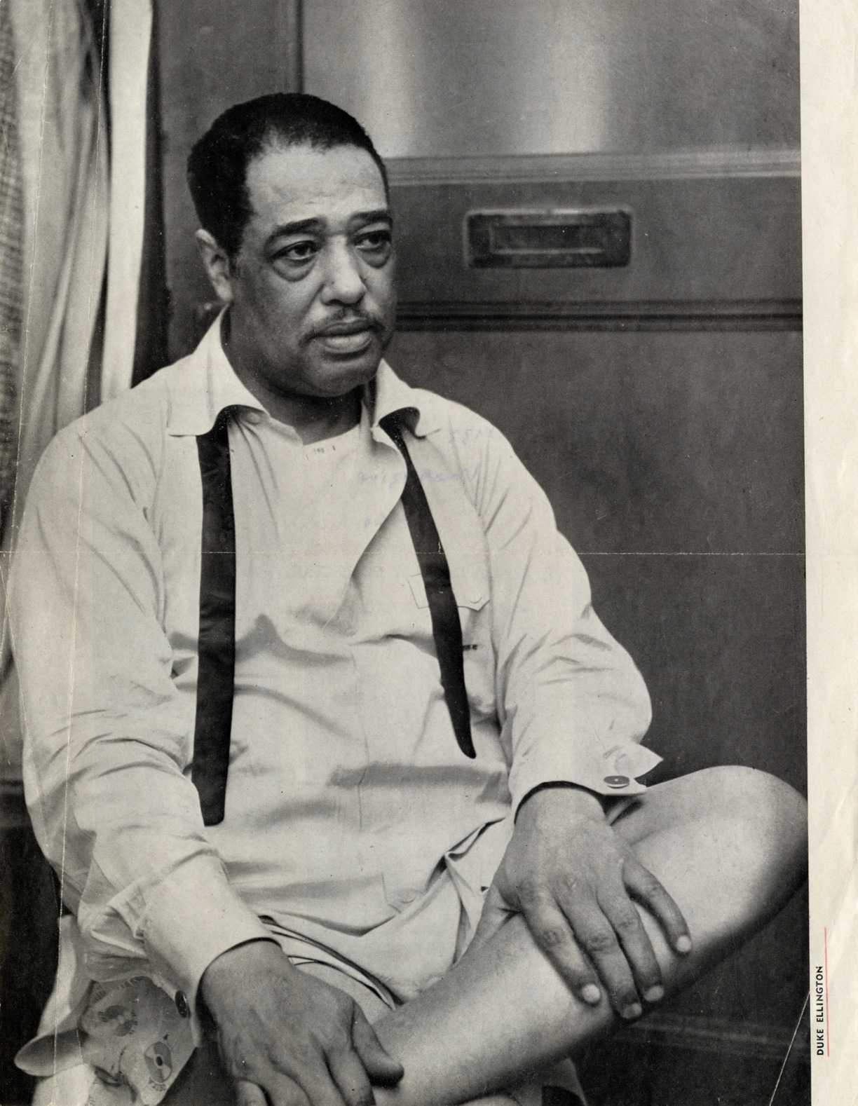 Favorite this☆ Duke Ellington Description: View of jazz musician, composer and bandleader Duke Ellington. Printed on front: "Duke Ellington." Details Resource ID: hk000813 Subject: Ellington, Duke, 1899-1974 African American jazz musicians Pianists African American composers African American conductors (Music) Clippings (Books, newspapers, etc.) Note (Source): Jazz magazine Date Issued: 1960-12 Format: 1 clipping ; 10.5 x 8.25 in. Member of: E. Azalia Hackley Collection Filing Location: Biography--Ellington, Duke Rights: Physical rights are retained by DPL. Copyright is retained in accordance with U.S. copyright laws.