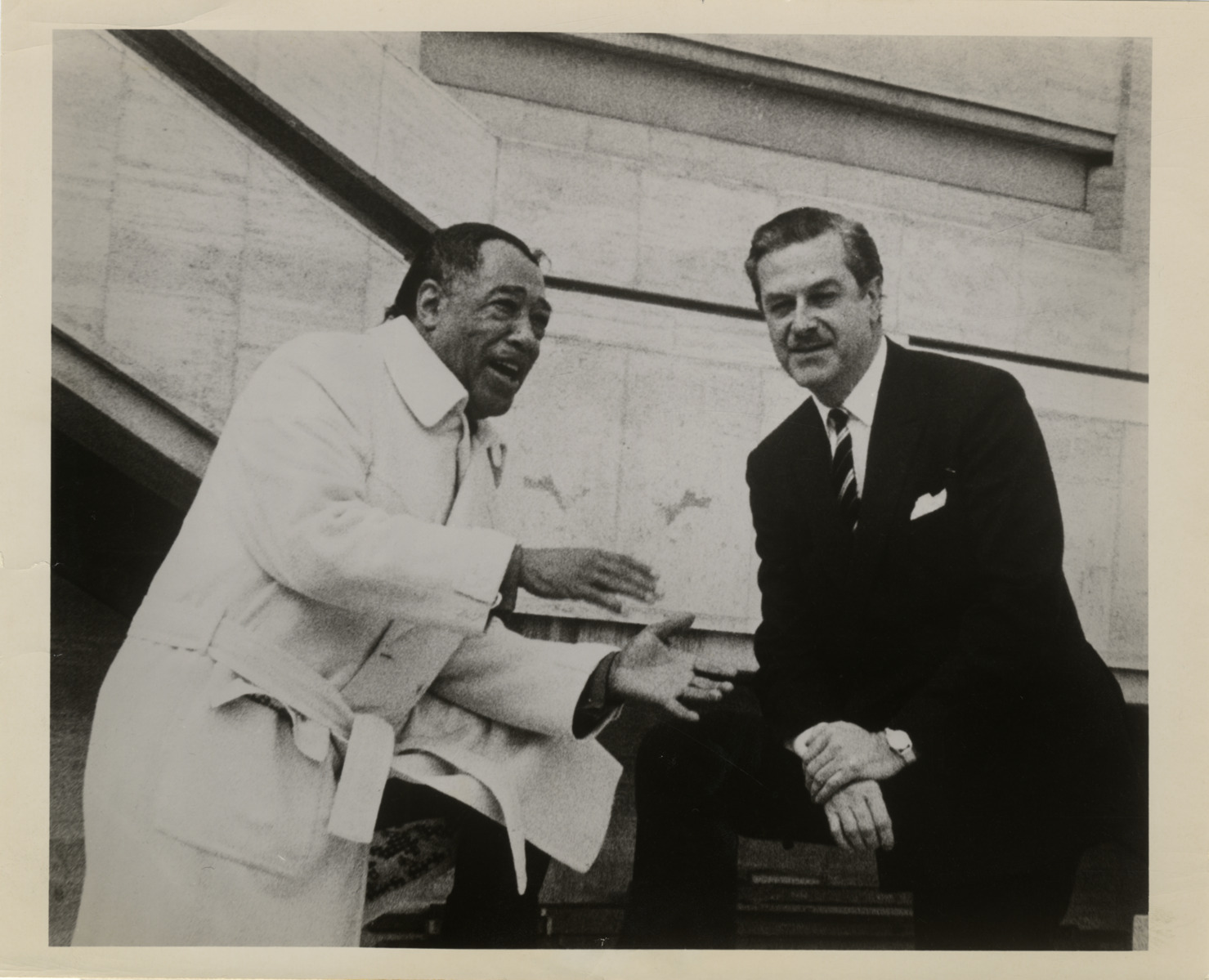 View of jazz musician, composer and bandleader Duke Ellington and Peter Mennin, head of the Juilliard School. Label on back: "From Harold H. Weicker, James F. Fox, Inc., 500 Fifth Avenue, New York, N.Y. 10036, 212/524-1180. For: Duke Ellington, Inc. For immediate release. Joy for the world. Duke Ellington (left) on Thanksgiving Day presented a check for $30,000 to Peter Mennin, head of New York's Juilliard School, to establish the Billy Strayhorn Memorial Scholarship at Juilliard. Had he lived, Strayhorn, the composer of 'Take the A train' and long-time Ellington collaborator, would have been 53 years old November 29. The check represents the proceeds of a benefit concert at Philharmonic Hall October 6 by Ellington, Lena Horne, Tony Bennett, Lou Rawls, Joe Williams and other artists who contributed their talent. The ceremony took place on the plaza in front of the new Juilliard building, under construction in Lincoln Center. The scholarship will be available in perpetuity to talented students regardless of race or nationality." Handwritten on back: "Duke Ellington."