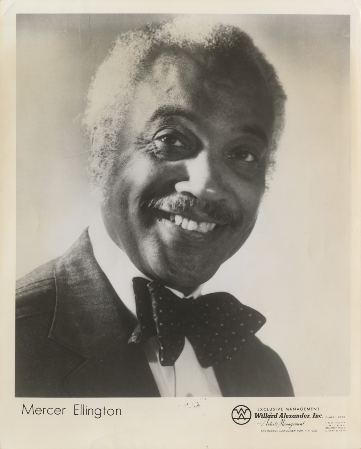 View of jazz musician, composer and bandleader Mercer Ellington. Printed on front: "Mercer Ellington. Exclusive management, Willard Alexander, Inc., artists management, 660 Madison Avenue, New York, N.Y. 10021, Plaza 1-7070. New York, Chicago, Beverly Hills, London." Handwritten on back: "Ellington, Mercer, bandleader."