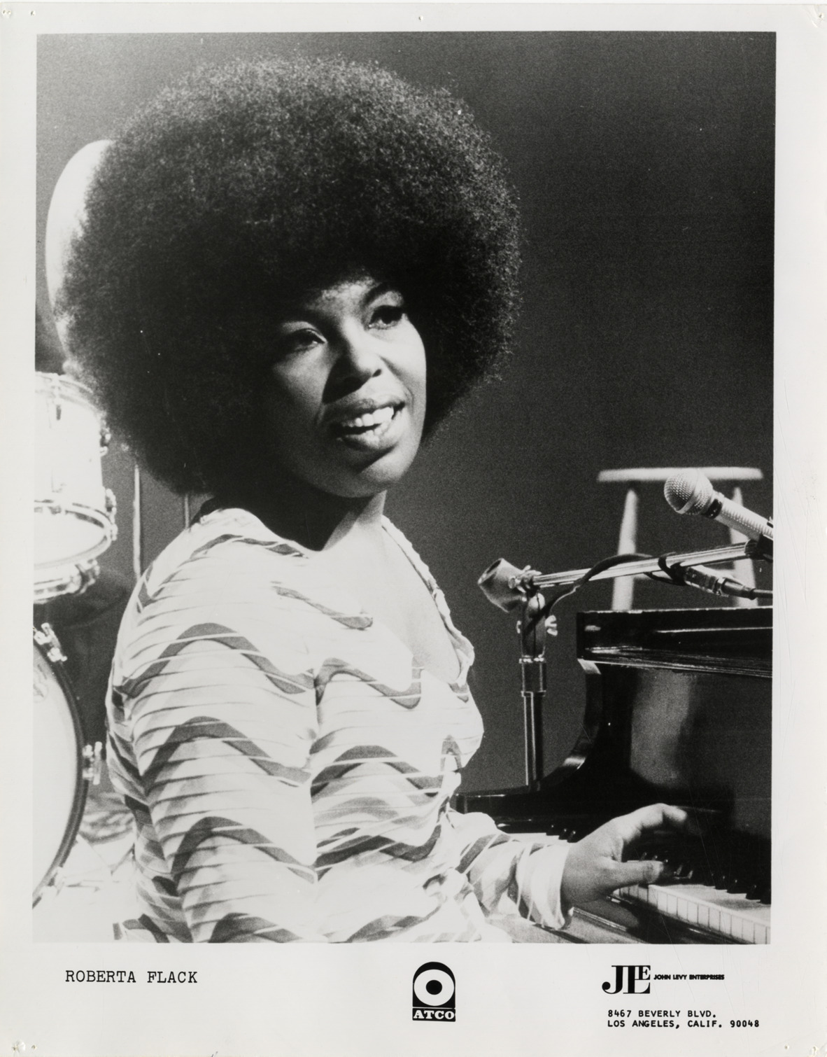 Favorite this☆ Roberta Flack Description: Portrait of singer Roberta Flack. Printed on front: "Roberta Flack, ATCO, John Levy Enterprises, 8467 Beverly Blvd., Los Angeles, Calif. 90048." Handwritten on back: "Roberta Flack." Details Resource ID: hk000850 Subject: Flack, Roberta African American women singers Photographic prints Date Issued: Unknown year Format: 1 photographic print ; 10 x 8 in. Member of: E. Azalia Hackley Collection Filing Location: Biography--Flack, Roberta Rights: Physical rights are retained by DPL. Copyright is retained in accordance with U.S. copyright laws.
