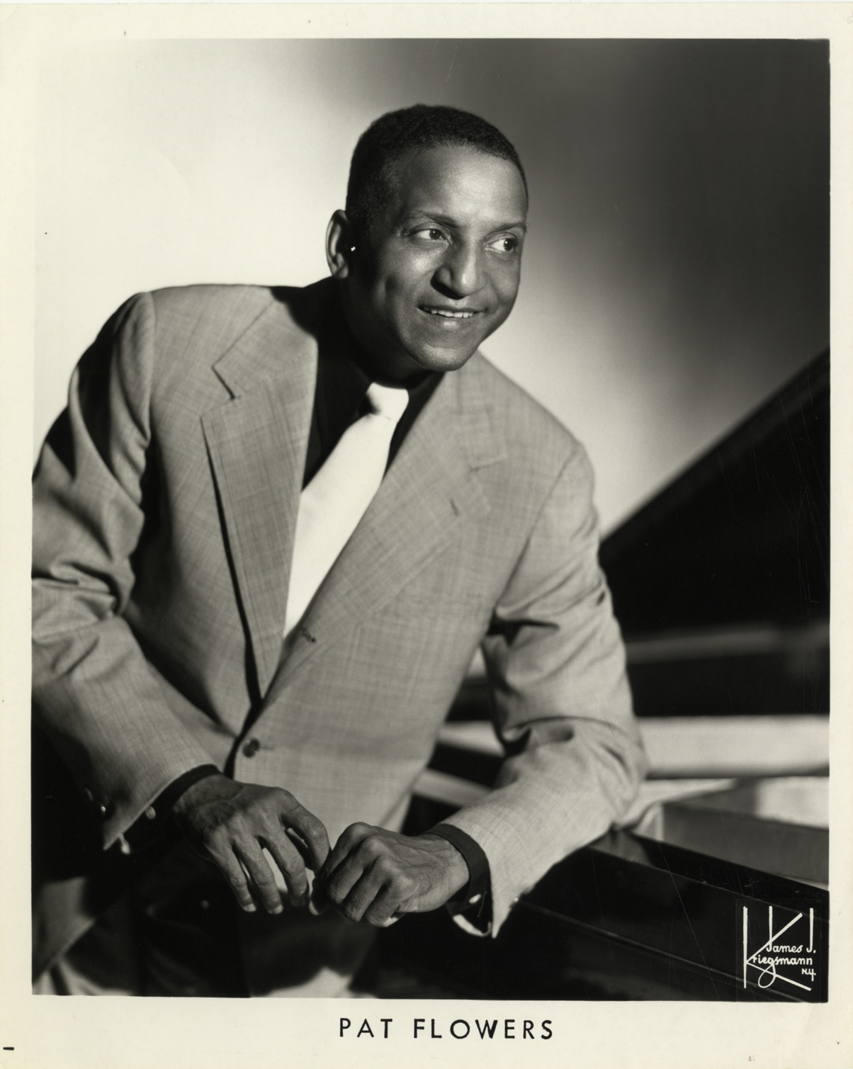 Portrait of pianist Pat Flowers. Printed on front: "Pat Flowers. James J. Kriegsmann, N.Y." Handwritten on back: "Pat Flowers, pianist."