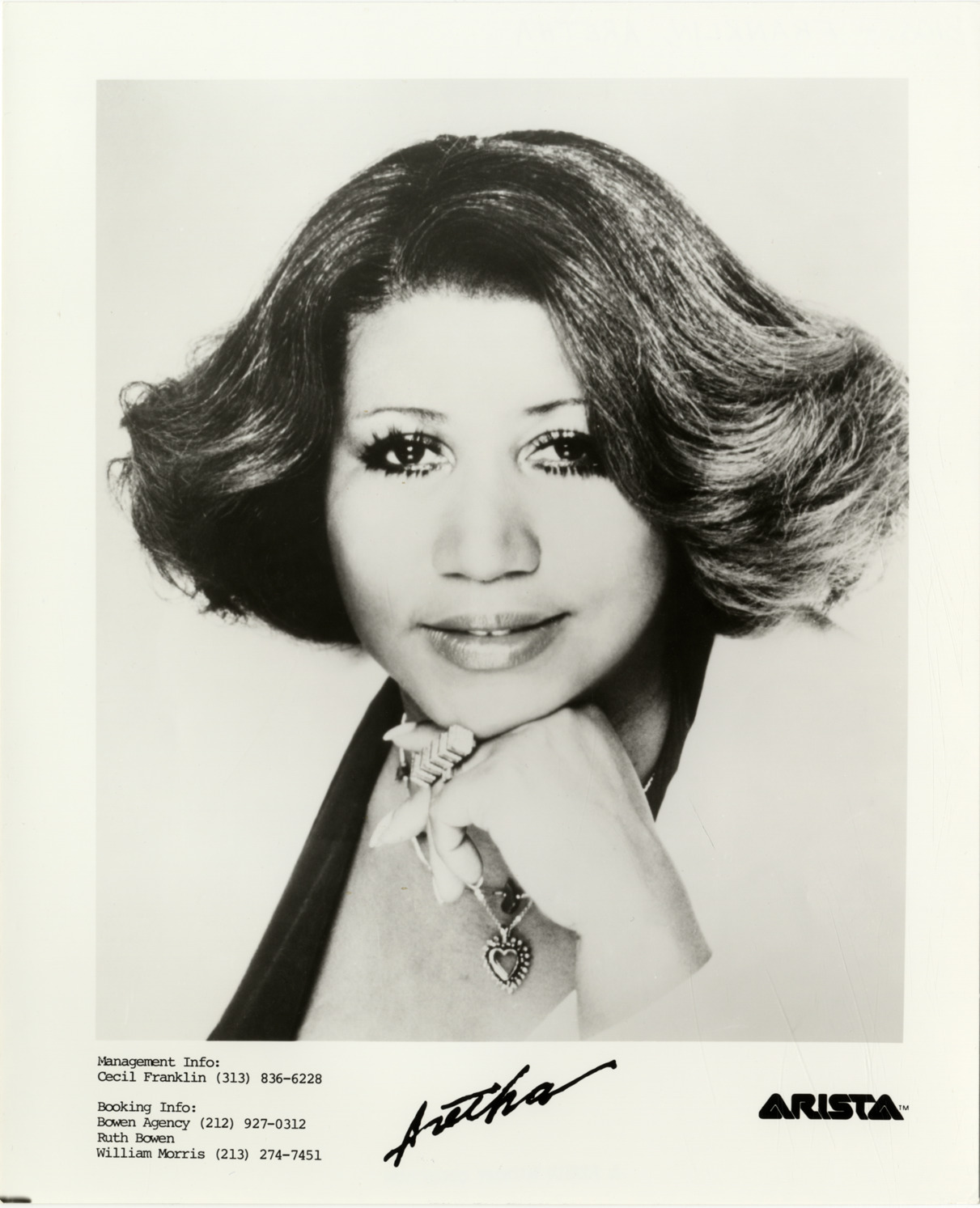 Portrait of singer Aretha Franklin. Printed on front: "Aretha. Arista. Management info: Cecil Franklin (313) 836-6228. Booking info: Bowen Agency (212) 927-0312. Ruth Bowen, William Morris (213) 274-7451."
