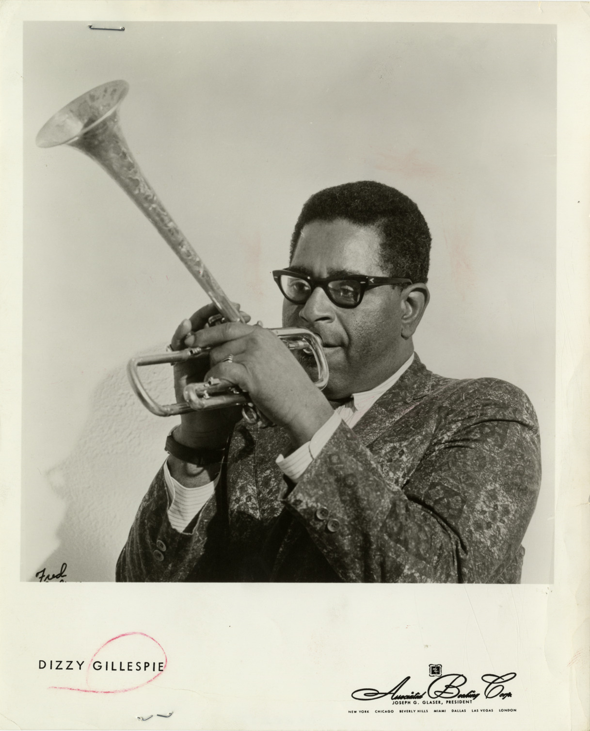 View of musician Dizzy Gillespie, playing trumpet. Printed on front: "Dizzy Gillespie. Associated Booking Corp., Joseph G. Glaser, President. New York, Chicago, Beverly Hills, Miami, Dallas, Las Vegas, London."