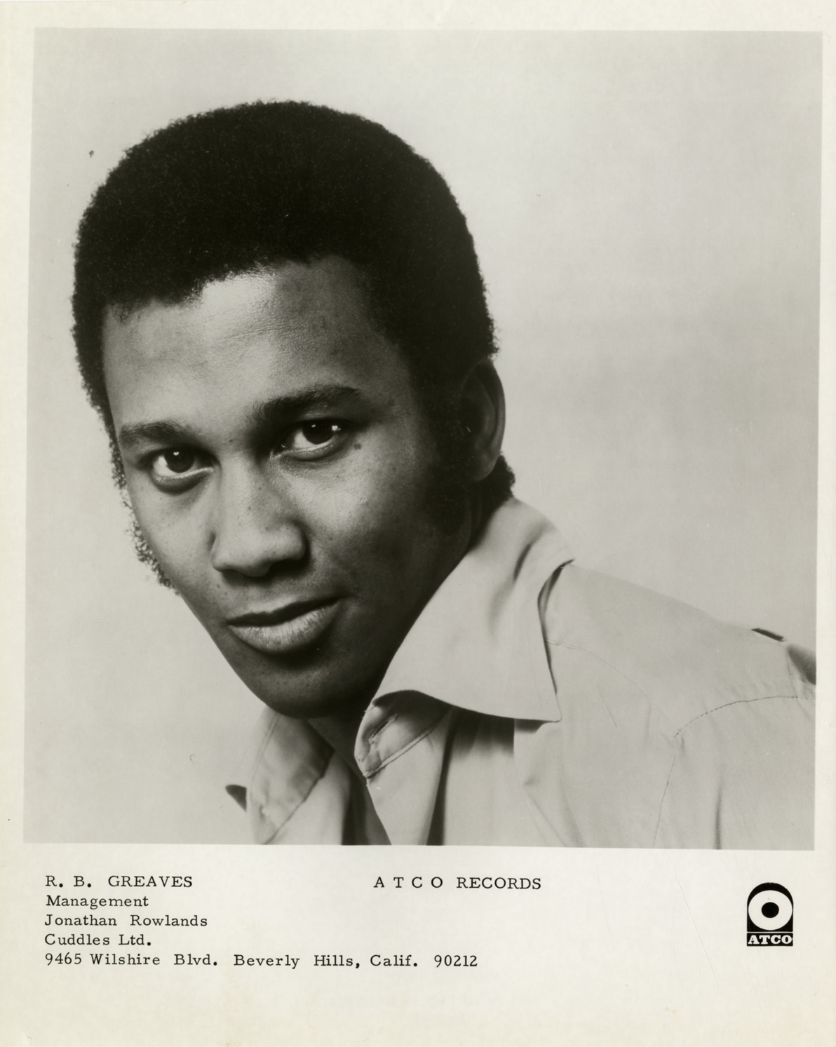 Favorite this☆ R.B. Greaves Description: Portrait of singer R.B. Greaves. Printed on front: "R.B. Greaves, ATCO Records. Management, Jonathan Rowlands, Cuddles, Ltd., 9465 Wilshire Blvd., Beverly Hills, Calif. 90212." Details Resource ID: hk000917 Subject: Greaves, R. B. African American singers Photographic prints Date Issued: Unknown year Format: 1 photographic print ; 10 x 8 in. Member of: E. Azalia Hackley Collection Filing Location: Biography--Greaves, R.B. Rights: Physical rights are retained by DPL. Copyright is retained in accordance with U.S. copyright laws.