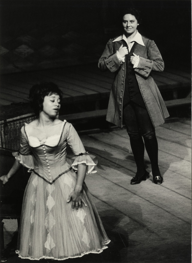 View of soprano Reri Grist as Zerbinetta and Sena Jurinac as The Composer in Richard Strauss' opera, "Ariadne auf Naxos." Stamped on back: "Salzburger Festspiele 1965, 'Ariadne auf Naxos.' Salzburger Festspiele Presseburo. Dieses Pressephoto kann in Zeitungen und Zeitschriften honorarfrei reproduziert werden, seng der Vermerk 'Presseburo Salzburger Festspiele' oder 'P.S.F.' beigefugt wird. Publication autorisee seulement avec la mention 'Presseburo Salzburger Festspiele' ou 'P.S.F.' Publication permitted only when 'Presseburo Salzburger Festspiele' or 'P.S.F.' is mentioned." Typed on back: "Reri Grist as Zerbinetta, Sena Jurinac as The Composer."