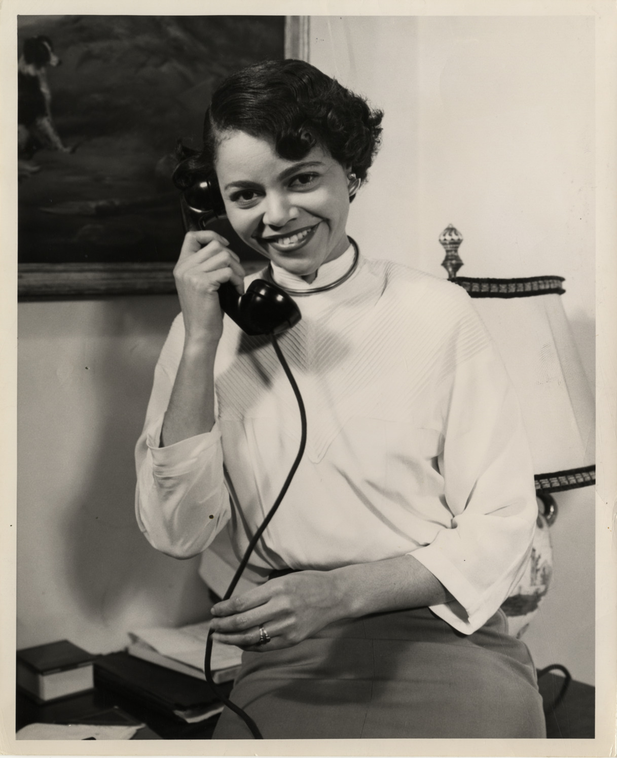 Portrait of singer and actress Ida James, holding a telephone receiver. Label on back: "Ida James will appear in the new Sarett and Herbert Rudley play, "How long till summer,' the Leon J. Bronesky and Edward M. Gilbert production opening at the Playhouse, Dec. 27." Stamped on back: "Please credit photograph by Talbot, 1595 B'way." Handwritten on back: "Ida James in 'How long till summer.'"