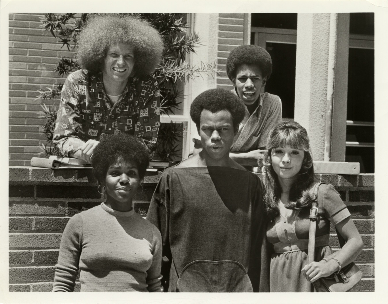 View of actors Heshimu, David Jolliffe, Eric Laneuville, Ta-Tanisha and Judy Strangis in the television series, "Room 222." Label on back: "Photo release, ABC Press Relations, 1330 Avenue of the Americas, New York, New York 10019. Subjects: David Jollife [sic], Eric Laneuville (top row l-r), Ta-Tanisha, Heshimu, Judy Strangis (bottom row l-r). Program: Room 222, 'America's guest.' On air: Friday, August 11, (9:00-9:30 p.m., EDT). 7/18/72."