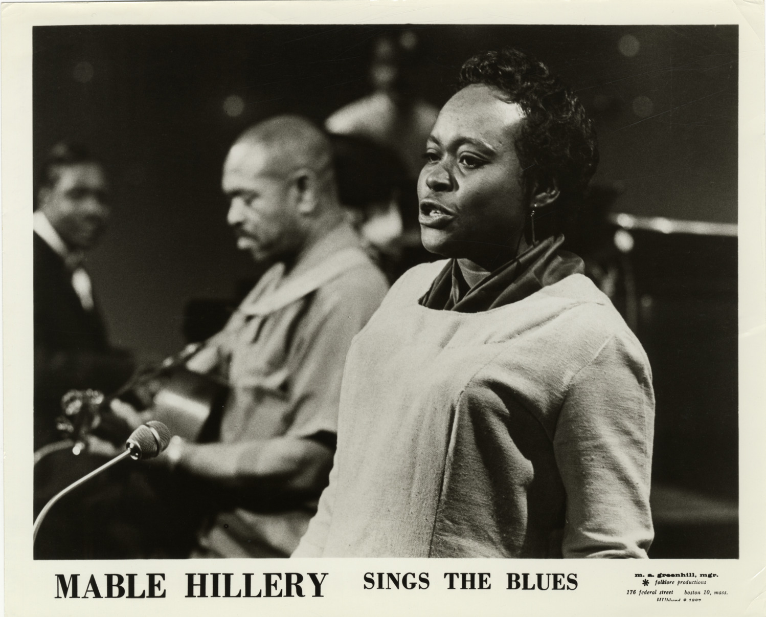 View of singer Mable Hillery. Printed on front: "Mable Hillery sings the blues. M.S. Greenhill, Mgr. Folklore Productions, 176 Federal Street, Boston 10, Mass. Hubbard 2-1827."