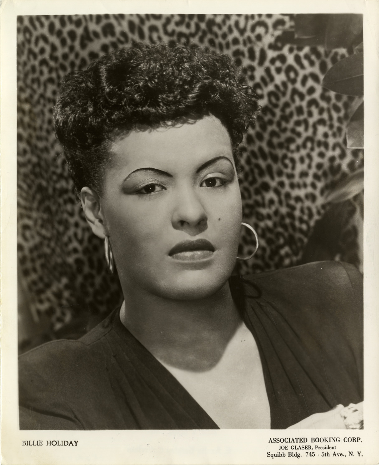 Favorite this☆ Billie Holiday Description: Portrait of singer Billie Holiday. Printed on front: "Billie Holiday. Associated Booking Corp. Joe Glaser, president. Squibb Bldg. 745, 5th Ave., N.Y." Details Resource ID: hk001068 Subject: Holiday, Billie, 1915-1959 African American women singers Photographic prints Date Issued: Unknown year Format: 1 photographic print ; 10 x 8.25 in. Member of: E. Azalia Hackley Collection Filing Location: Biography--Holiday, Billie Rights: Physical rights are retained by DPL. Copyright is retained in accordance with U.S. copyright laws.