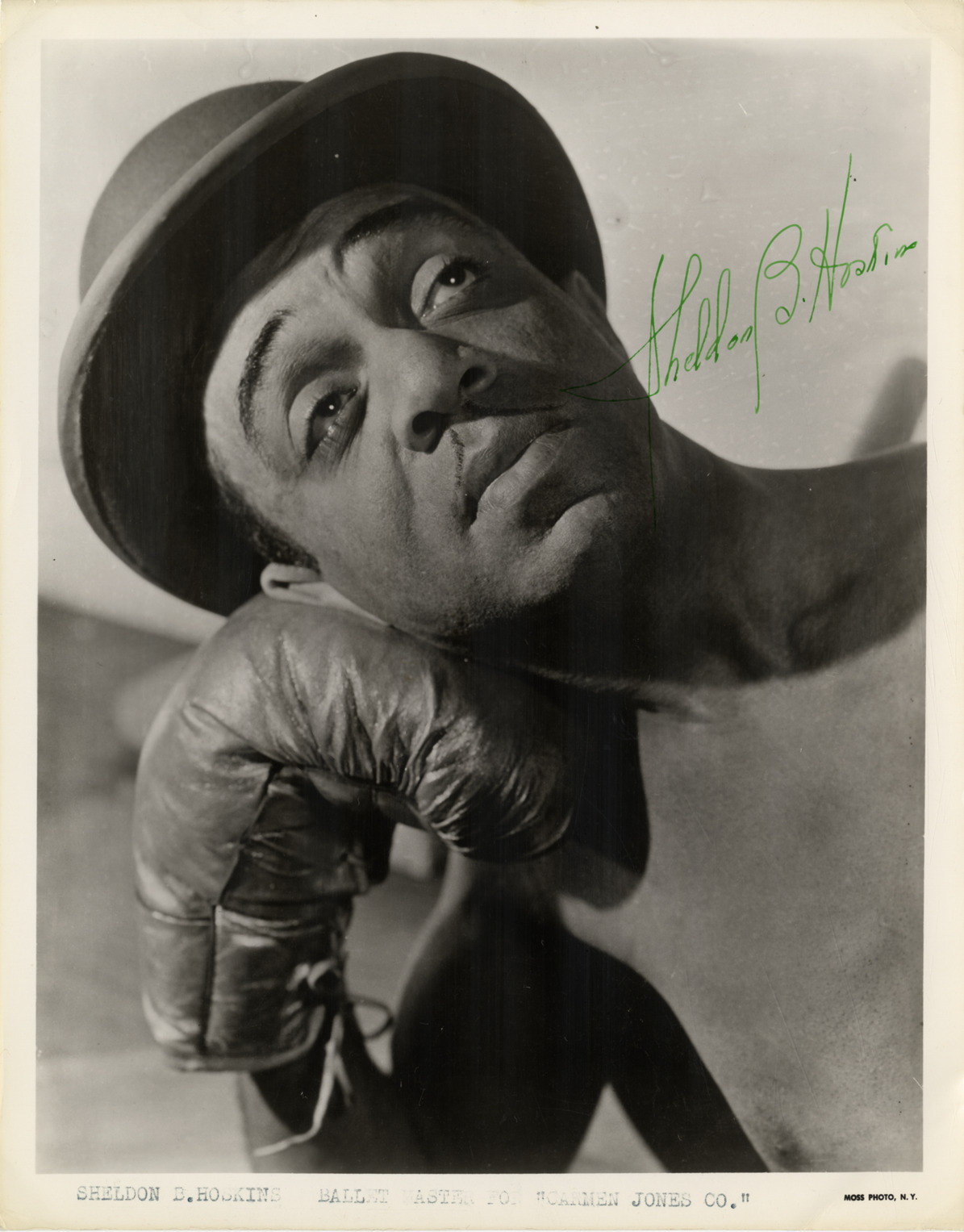 Favorite this☆ Sheldon B. Hoskins Description: Portrait of dancer Sheldon B. Hoskins as dancing boxer in the musical, "Carmen Jones." Autographed on front: "Sheldon B. Hoskins." Typed on front: "Sheldon B. Hoskins, ballet master for 'Carmen Jones Co.'" Printed on front: "Moss Photo, N.Y." Details Resource ID: hk001083 Creator: Moss Photo Subject: Hoskins, Sheldon B. Hoskins, Sheldon B.--Autographs African American dancers Photographers--New York (State)--New York Photographic prints Date Issued: Unknown year Format: 1 photographic print ; 10 x 8 in. Member of: E. Azalia Hackley Collection Filing Location: Biography--Hoskins, Sheldon B. Rights: Physical rights are retained by DPL. Copyright is retained in accordance with U.S. copyright laws.