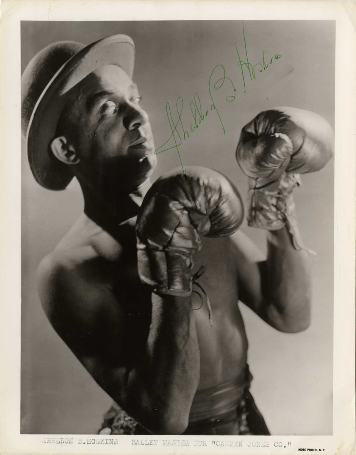 Favorite this☆ Sheldon B. Hoskins Description: Portrait of dancer Sheldon B. Hoskins as dancing boxer in the musical, "Carmen Jones." Autographed on front: "Sheldon B. Hoskins." Typed on front: "Sheldon B. Hoskins, ballet master for 'Carmen Jones Co.'" Printed on front: "Moss Photo, N.Y." Details Resource ID: hk001086 Creator: Moss Photo Subject: Hoskins, Sheldon B. Hoskins, Sheldon B.--Autographs African American dancers Photographers--New York (State)--New York Photographic prints Date Issued: Unknown year Format: 1 photographic print ; 10 x 8 in. Member of: E. Azalia Hackley Collection Filing Location: Biography--Hoskins, Sheldon B. Rights: Physical rights are retained by DPL. Copyright is retained in accordance with U.S. copyright laws.