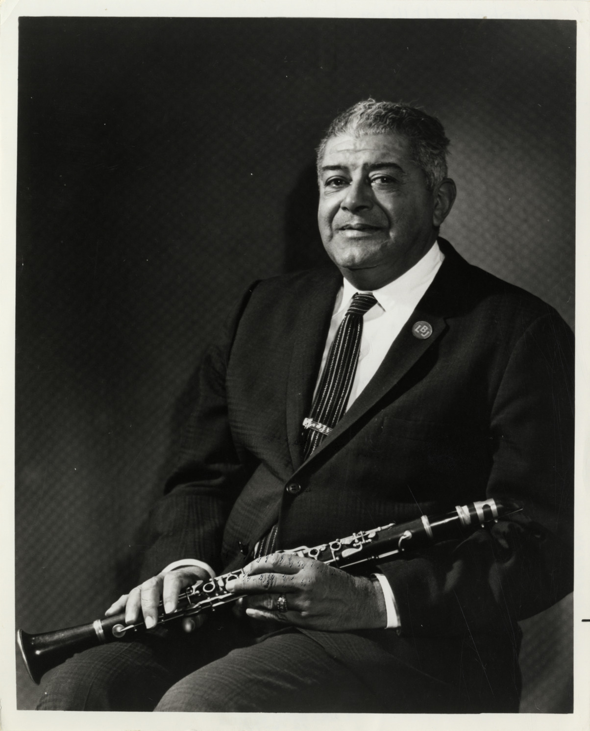 View of musician Willie Humphrey, posing with clarinet. Stamped on back: "Pryor-Menz Attractions, Box 455, Council Bluffs, Iowa, 51501. William Humphrey. Preservation Hall Jazz Band." Label on back: "Willie Humphrey, clarinet." Handwritten on back: "Humphrey, William."