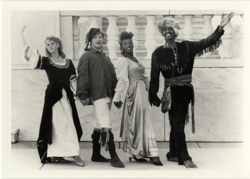 View of actors Roosevelt T. Johnson, Ursula Buckanes, Alycea Hutchusson and Gerard Smith in costume for the Madame Cadillac Dance Theatre. Handwritten on back: "Mme. Cadillac Dance Theatre, l. to r. Alycea Hutchusson, Gerard LA Smith, Ursula Buckanes, Roosevelt Johnson."