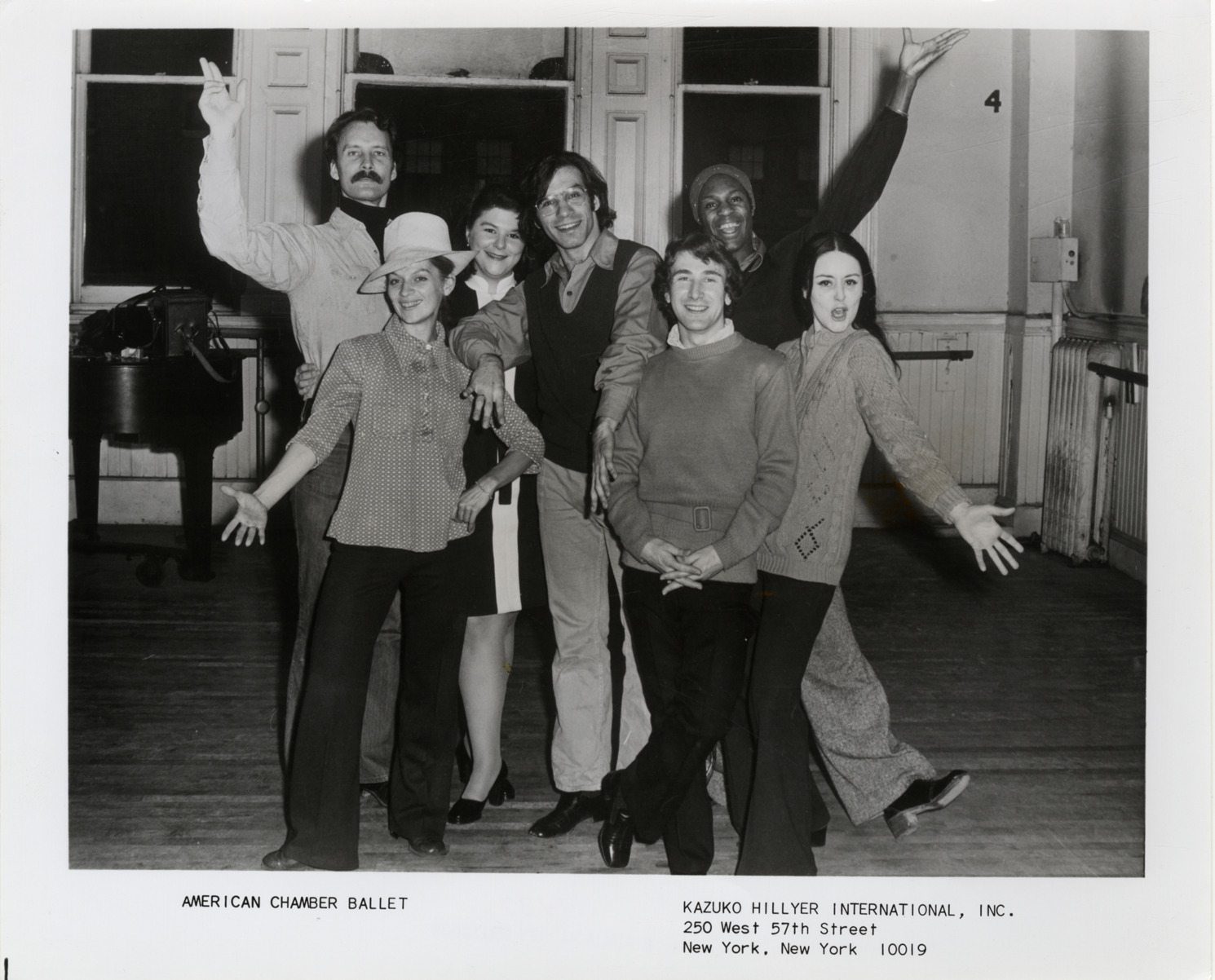 View of dancer and choreographer Rael Lamb posing with members of the American Chamber Ballet. Printed on front: "American Chamber Ballet. Kazuko Hillyer International, Inc. 250 West 57th Street, New York, New York 10019." Label on back: "This photo: (l.-r.) Warren Ruud (Technical Director), Ani Blackburn (Dancer), Phyllis Mortimer (Lighting Designer), Joel Benjamin (Artistic Director), Wayne Stuart Newberry (Assistant Director), Rael Lamb (Guest Choreographer), Trutti Gasparinetti (Ballet Mistress). Photo by Nick Carter." Handwritten on back: "Rael Lamb."