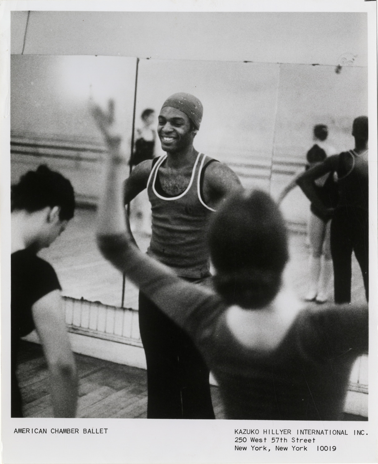View of dancer and choreographer Rael Lamb rehearsing with members of the American Chamber Ballet. Printed on front: "American Chamber Ballet. Kazuko Hillyer International, Inc. 250 West 57th Street, New York, New York 10019." Handwritten on back: "Rael Lamb."