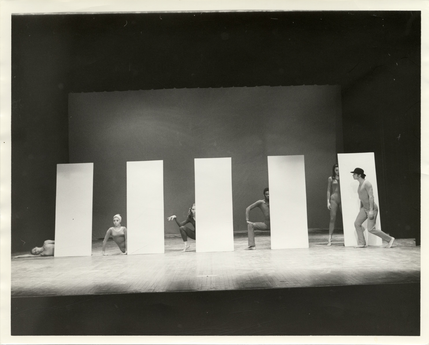 View of Rael Lamb and dancers performing in the ballet, "Screenplay," in Augusta, Georgia. Stamped on back: "Photograph by 'Cookie' Snyder & Tom Pitts, phone 766-792, P.O. Box 457, Clemmons, N.C. 27012." Handwritten on back: "December 8, 1968. Augusta, Fa. Rael-Robert Lamb, 'Screenplay,' Job Sanders."