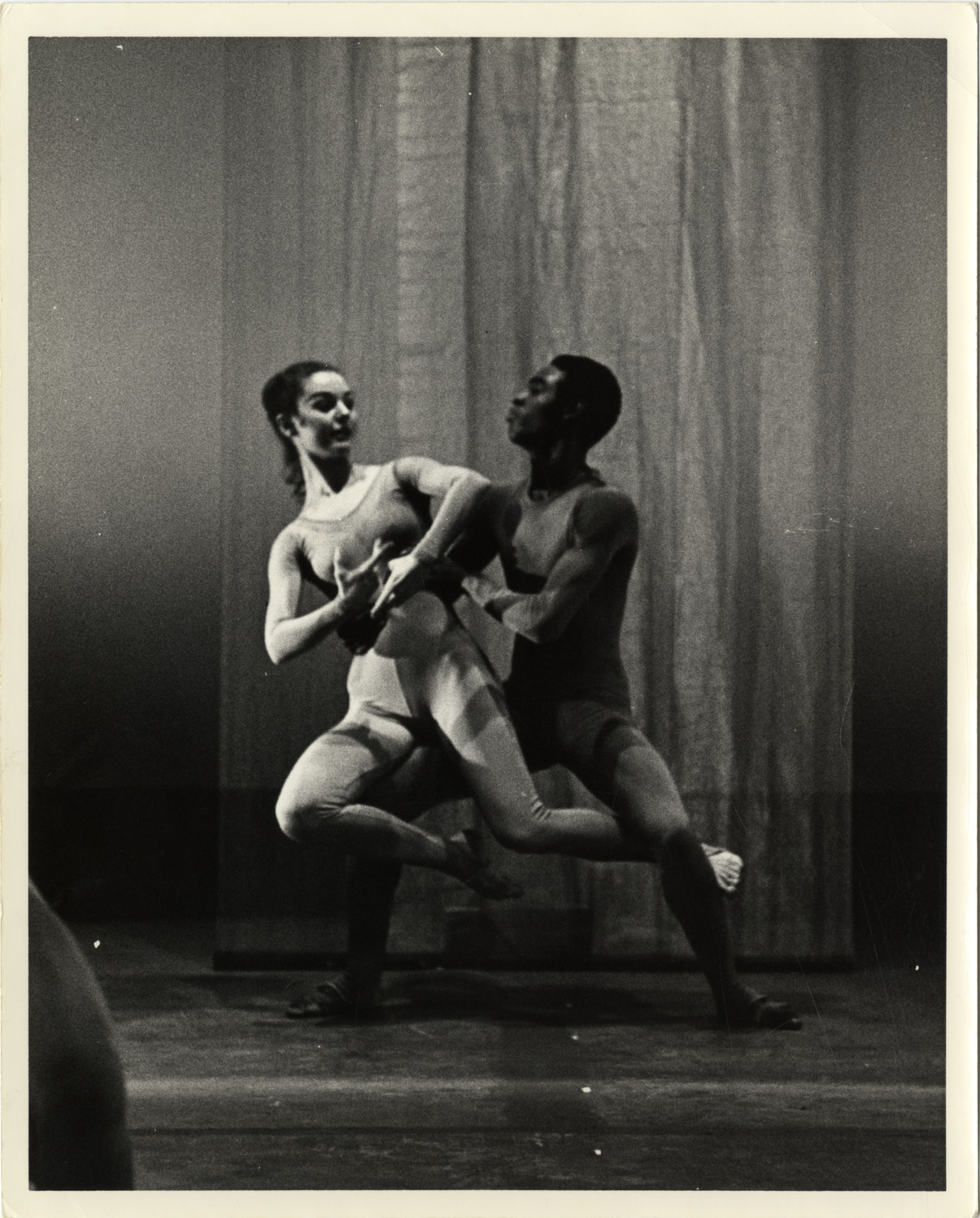 View of dancer Rael Lamb performing with unidentified dancer in the ballet, "Dance panels," at the Copland Festival. Handwritten on back: "Rael Lamb. North Carolina School of Arts. Ballet, 'Dance panels,' Copland Festival, March 11, 1971."