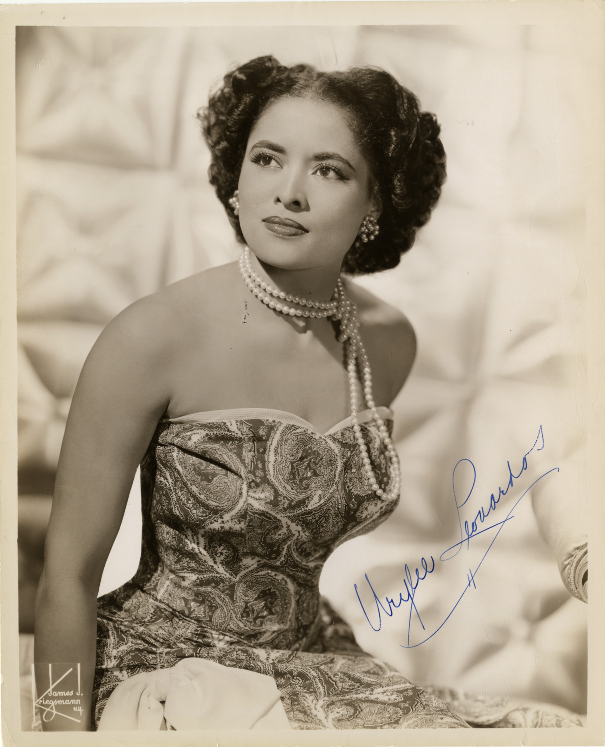 Portrait of singer and actress Urylee Leonardos. Autographed on front: "Urylee Leonardos." Printed on front: "James J. Kriegsmann, N.Y."