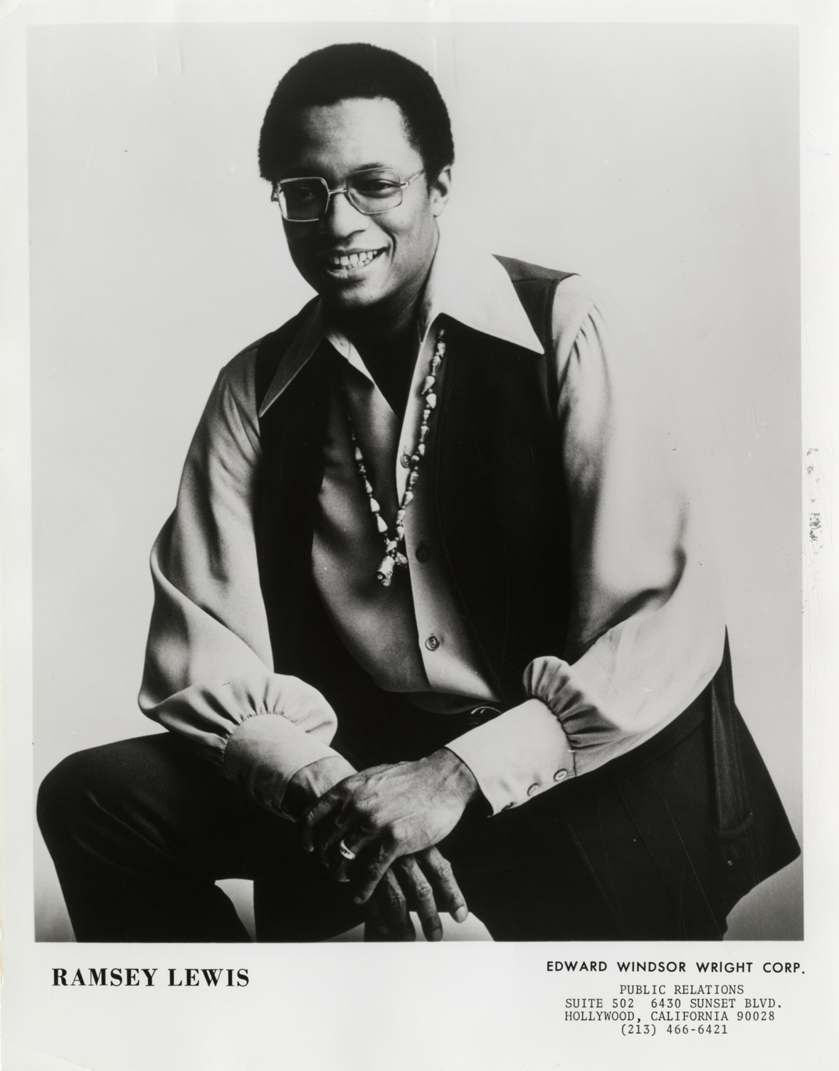Favorite this☆ Ramsey Lewis Description: Portrait of pianist Ramsey Lewis. Printed on front: "Ramsey Lewis. Edward Windsor Wright Corp., public relations, Suite 502, 6430 Sunset Blvd., Hollywood, California 90028, (213) 466-6421." Handwritten on back: "Lewis, Ramsey." Details Resource ID: hk001228 Subject: Lewis, Ramsey African American pianists Photographic prints Date Issued: Unknown year Format: 1 photographic print ; 10 x 8 in. Member of: E. Azalia Hackley Collection Filing Location: Biography--Lewis, Ramsey Rights: Physical rights are retained by DPL. Copyright is retained in accordance with U.S. copyright laws.