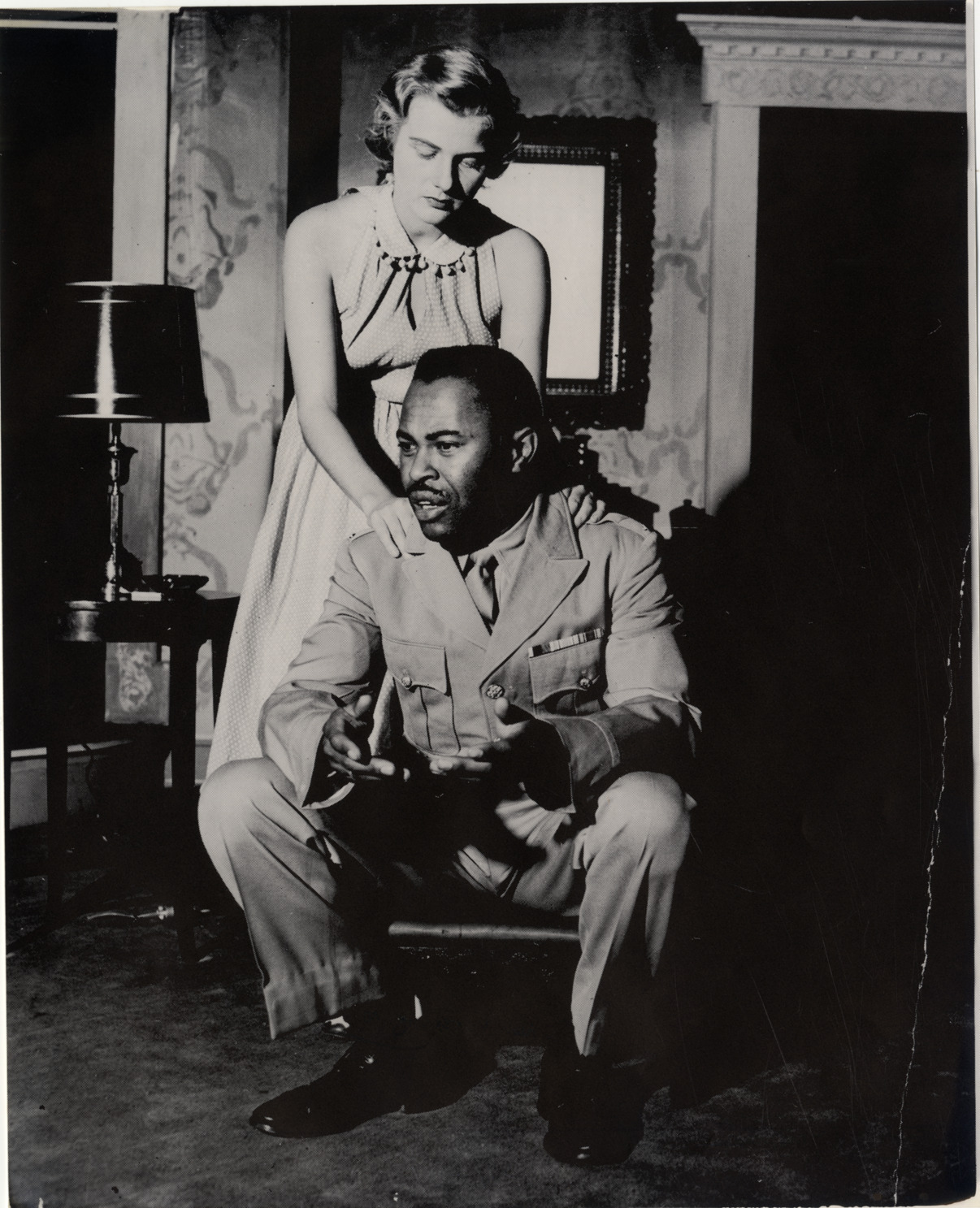 Favorite this☆ Walter Mason and Barbara Busby Description: View of actor Walter Mason and actress Barbara Busby in a scene from "Deep are the roots." Handwritten on back: "Mason, Walter. Producer, director, actor. Barbara Busby, 'Deep are the roots,' 10-15-53." Details Resource ID: hk001269 Subject: Mason, Walter, 1926- African American actors Busby, Barbara Photographic prints Date Issued: 1953-10-15 Format: 1 photographic print ; 10 x 8 in. Member of: E. Azalia Hackley Collection Filing Location: Biography--Mason, Walter Rights: Physical rights are retained by DPL. Copyright is retained in accordance with U.S. copyright laws.