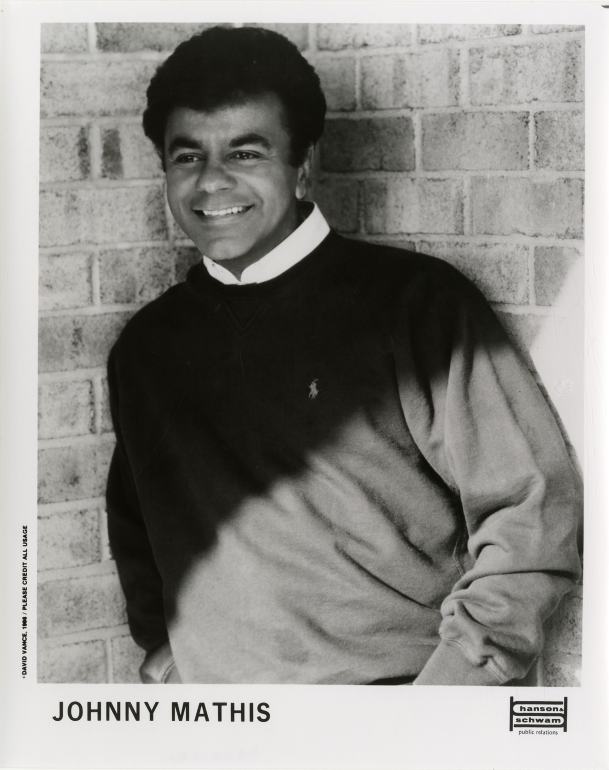 Favorite this☆ Johnny Mathis Description: Portrait of singer Johnny Mathis. Printed on front: "Johnny Mathis. Hanson & Schwam, public relations. David Vance, 1986. Please credit all usage." Details Resource ID: hk001282 Creator: Vance, David Subject: Mathis, Johnny African American singers Photographic prints Date Issued: 1986 Format: 1 photographic print ; 10 x 8 in. Member of: E. Azalia Hackley Collection Filing Location: Biography--Mathis, Johnny Rights: Physical rights are retained by DPL. Copyright is retained in accordance with U.S. copyright laws.
