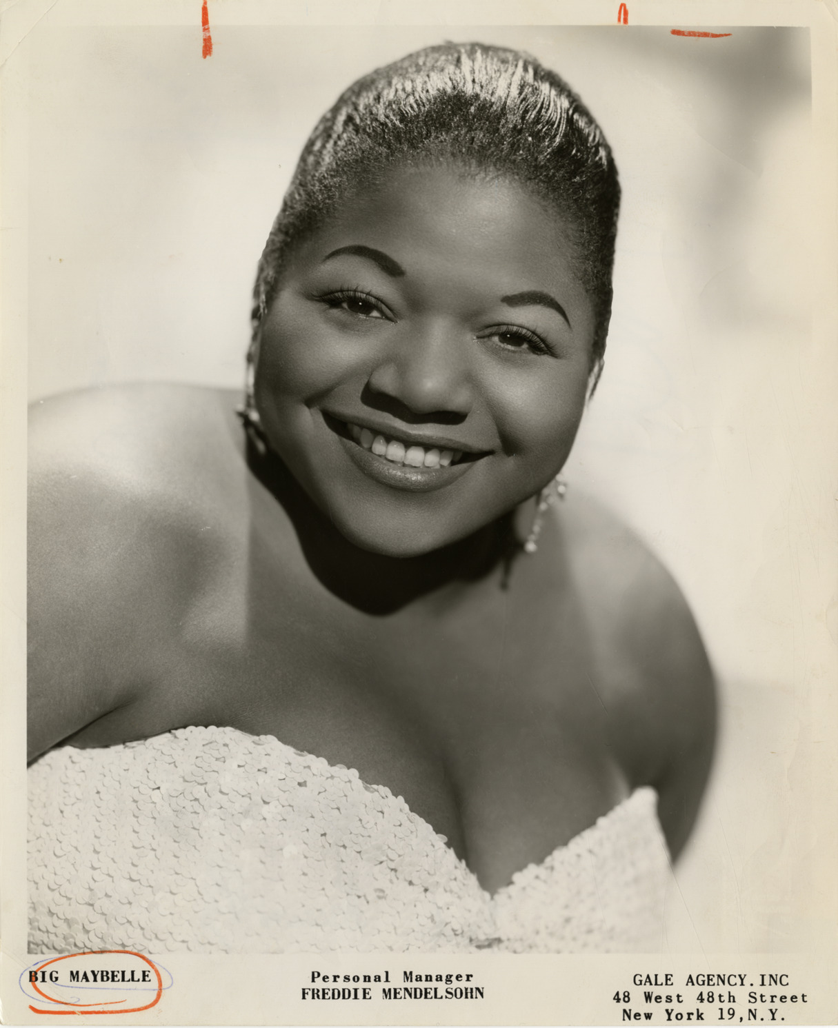 Favorite this☆ Big Maybelle Description: Portrait of blues singer Big Maybelle. Printed on front: "Big Maybelle. Personal manager Freddie Mendelsohn. Gale Agency, Inc. 48 West 48th Street, New York 19, N.Y." Details Resource ID: hk001289 Subject: Big Maybelle, 1924-1972 African American women singers Blues musicians Photographic prints Date Issued: Unknown year Format: 1 photographic print ; 10 x 8 in. Member of: E. Azalia Hackley Collection Filing Location: Biography--Mathis, Johnny Rights: Physical rights are retained by DPL. Copyright is retained in accordance with U.S. copyright laws.