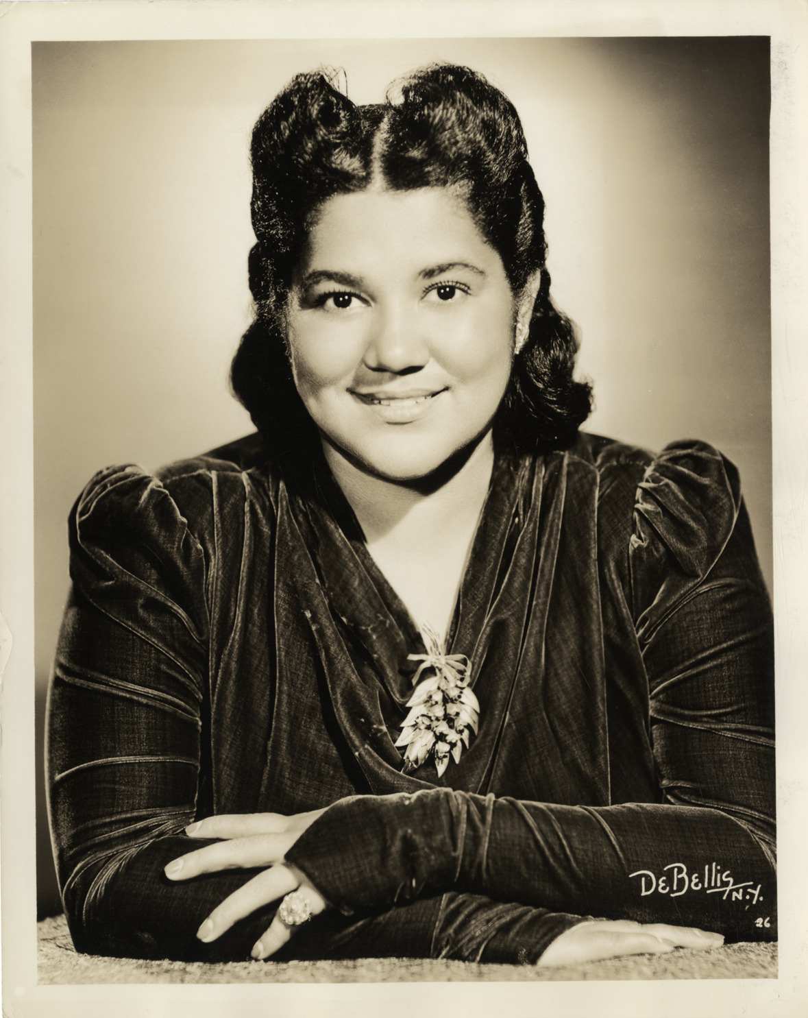 Portrait of soprano Dorothy Maynor. Printed on front: "De Bellis, N.Y." Stamped on back: "Dorothy Maynor, soprano. Lawrence Evans Artist Management, Inc., Division of Columbia Concerts, Inc., 113 West 57th St., New York. The courtesy of credit is requested. Thank you. De Bellis Studios, 1619 Broadway, N.Y.C., tel. Circle 6-0844."