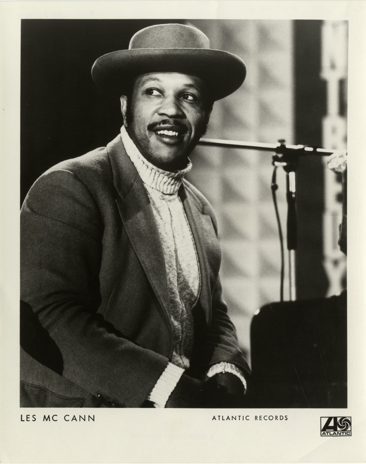 Portrait of pianist Les McCann. Printed on front: "Les McCann. Atlantic Records." Handwritten on back: "Les McCann."