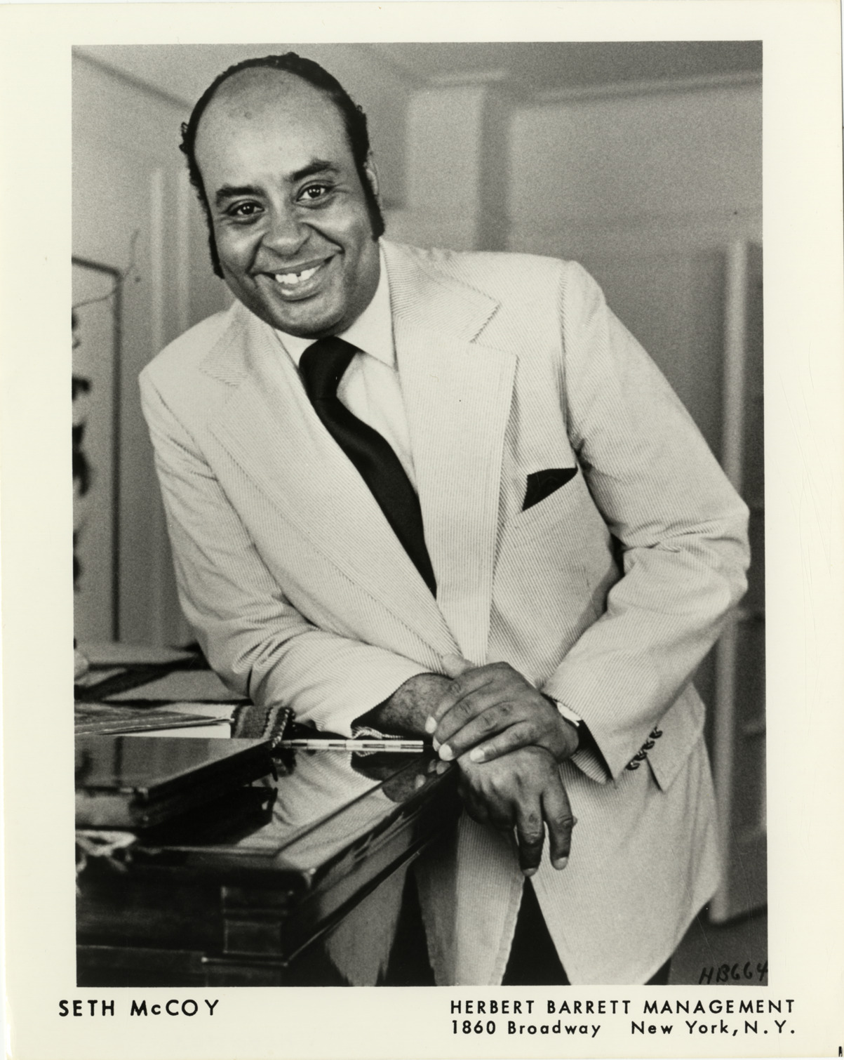 Favorite this☆ Seth McCoy Description: Portrait of tenor Seth McCoy. Printed on front: "Seth McCoy. Herbert Barrett Management, 1860 Broadway, New York, N.Y." Details Resource ID: hk001303 Subject: McCoy, Seth, 1928-1997 African American singers Photographic prints Date Issued: Unknown year Format: 1 photographic print ; 10 x 8 in. Member of: E. Azalia Hackley Collection Filing Location: Biography--McCoy, Seth Rights: Physical rights are retained by DPL. Copyright is retained in accordance with U.S. copyright laws.