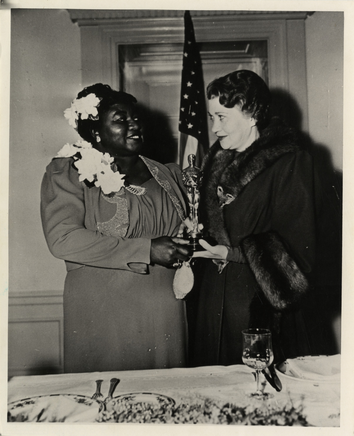 View of actresses Hattie McDaniel and Fay Bainter holding an Academy Award statuette. Label on back: "Blacks in American film: a photographic tribute. Hattie McDaniel was the first Black person to receive an Academy Award -- in 1939 for "Best supporting actress' for her role in 'Gone with the wind.' Hattie McDaniel, seen here with Fay Bainter, died on October 26, 1952. Her other film appearances include 'Judge Priest' (1935), 'Nothing sacred' (1937), 'Song of the south' (1947), and 'Mr. Blandings builds his dream house.' She was also seen in the 1952 television series 'Beulah.'" Handwritten on back: "McDaniel, Hattie."