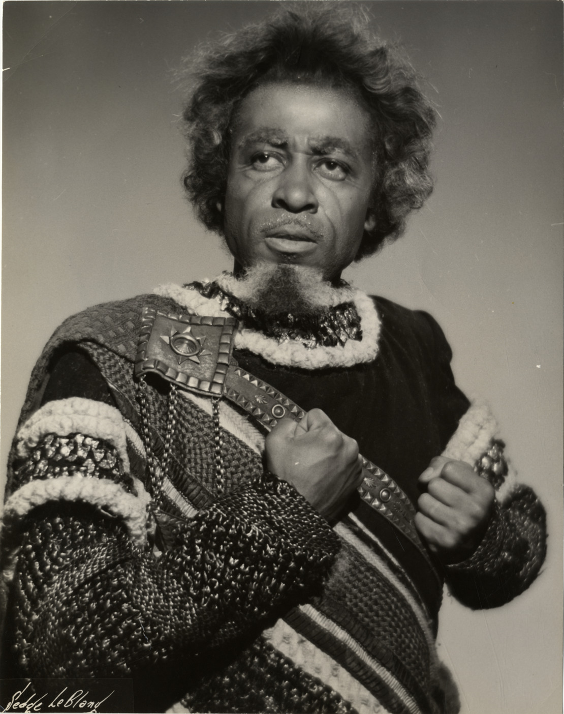 Portrait of baritone Robert McFerrin as Amonasro in Verdi's opera, "Aida." Stamped on back: "Only newspapers and magazines may reproduce this photograph. Please credit Sedge LeBlang, photographer for the Metropolitan Opera, West 39th St., N.Y. 18, N.Y. PE. 6-8640." Label on back: "Robert McFerrin, as Amonasro in Aida, role of his Metropolitan Opera debut, January 27, 1955."