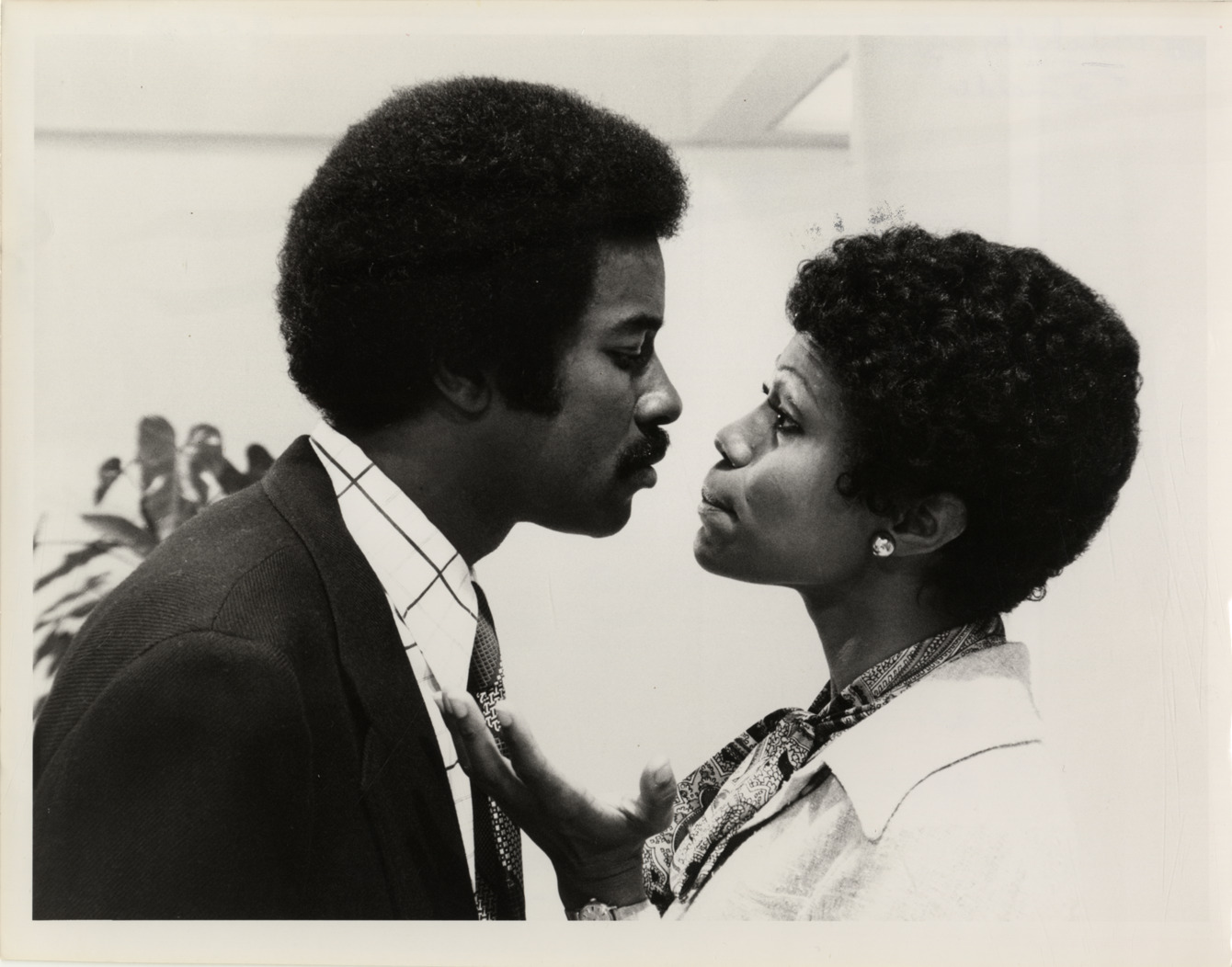 View of actor Don Mitchell and actress Joan Pringle in a scene from the television series, "Ironside." Label on back: "Exclusive to you in your city. Just married. New lawyer Mark Sanger (Don Mitchell) and his law school sweetheart, Diana (Joan Pringle) are newlyweds in 'What's new with Mark?' on the NBC Television Network's 'Ironside' colorcast Thursday, Sept. 26 (9-10 p.m. NYT). (8/30/74)." Handwritten on back: "Mitchell, Don, actor, 'Ironside.'"