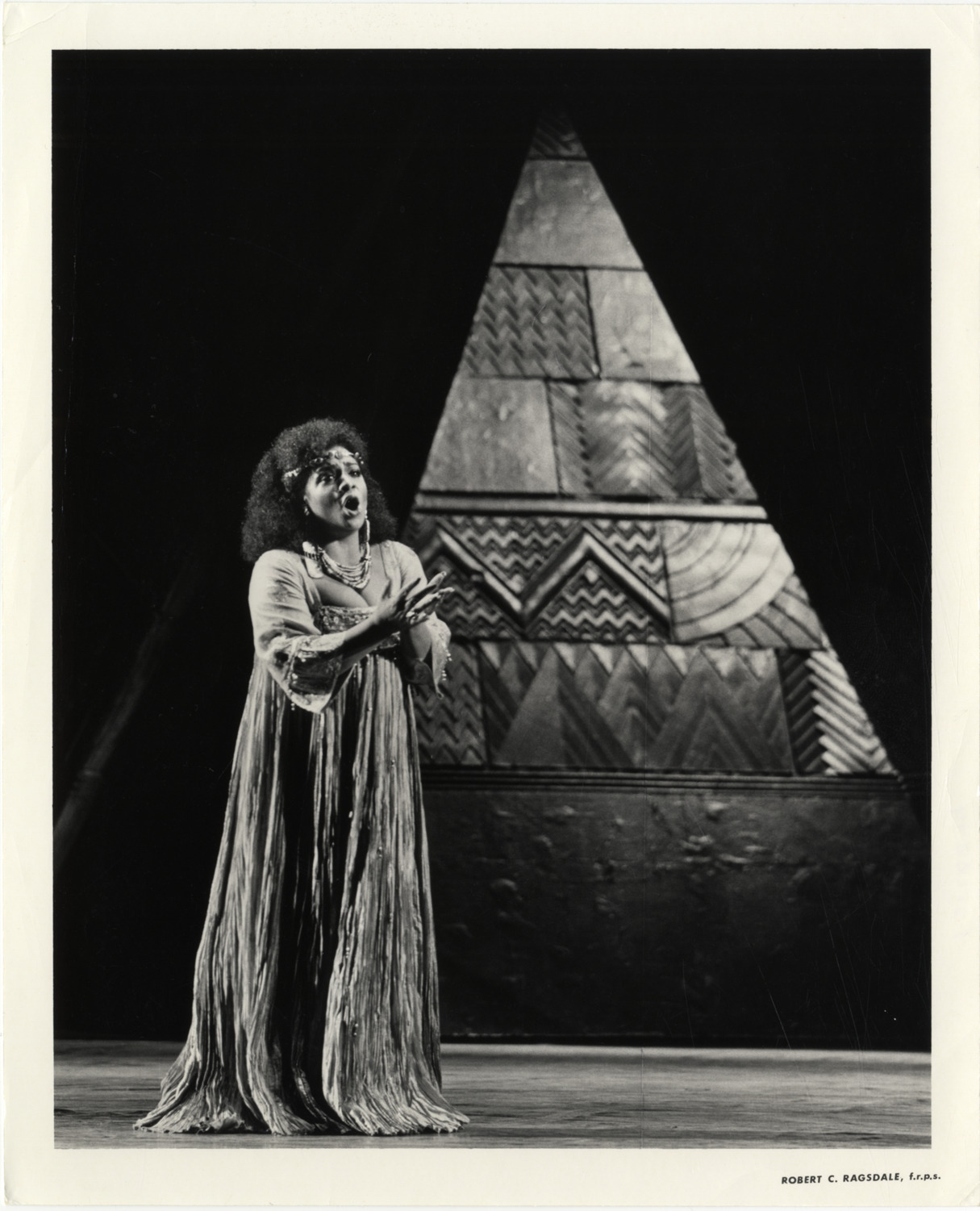 View of soprano Leona Mitchell performing the title role in Verdi's opera "Aida." Printed on front: "Robert C. Ragsdale, f.r.p.s." Stamped on back: "Robert C. Ragsdale Limited, photography. 21 Avenue Road, Toronto, M5R 2G1, (416) 967-3326. Please credit Robert C. Ragsdale, F.R.P.S." Label on back: "Soprano Leona Mitchell in her Canadian Opera Company debut in the title role of Giuseppe Verdi's Aida. (O'Keefe Centre, April 4, 7, 10, 13, 16, 19, 22, 25, 1986)."