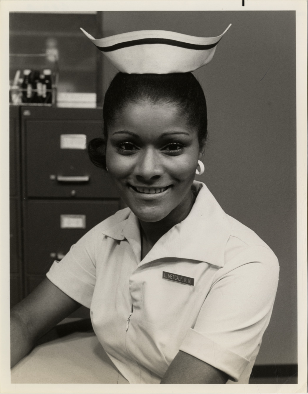 Portrait of actress Vera Moore, costumed as nurse Linda Metcalfe in the television series, "Another world." Label on back: "World's nurse. Vera Moore plays nurse Linda Metcalfe in the daytime dramatic serial, 'Another world,' colorcast on the NBC Television Network Mondays through Fridays (3-4 p.m. NYT). The program is network TV's first one-hour daytime serial. (1/10/75). NBC-TV caption. Subject: Vera Moore. Program: 'Another world.' Time: NBC Television Network colorcasts, Mondays through Fridays, (3-4 p.m. NYT)."